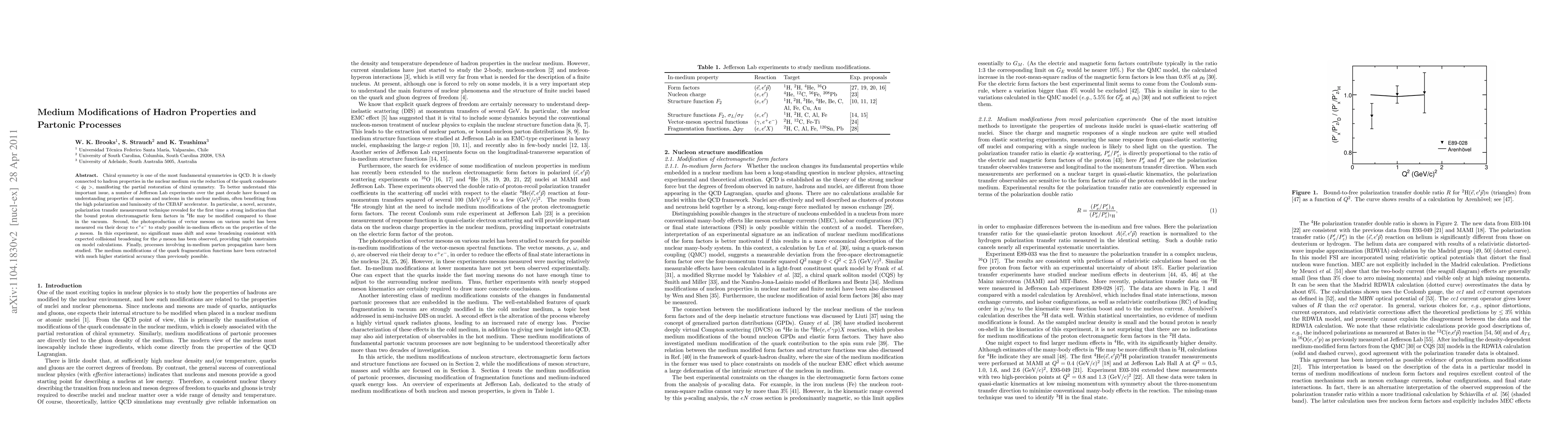 This paper explores how chiral symmetry affects hadron properties in nuclear mediums, using Jefferson Lab experiments to investigate modifications in mesons and nucleons. It finds indications of altered electromagnetic form factors in bound protons in 4He and observes slight broadening but no significant mass shift in rho mesons, while also improving the accuracy of parton propagation studies.