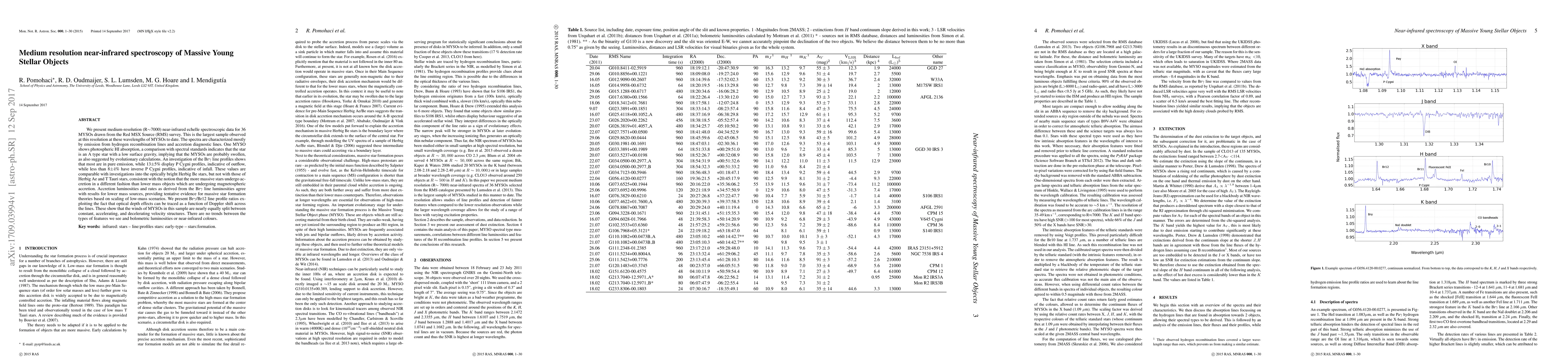 We present medium-resolution (R~7000) near-infrared echelle spectroscopic data for 36 MYSOs drawn from the Red MSX Source (RMS) survey. This is the largest sample observed at this resolution at these wavelengths of MYSOs to date. The spectra are characterized mostly by emission from hydrogen recombination lines and accretion diagnostic lines. One MYSO shows photospheric HI absorption, a comparison with spectral standards indicates that the star is an A type star with a low surface gravity, implying that the MYSOs are probably swollen, as also suggested by evolutionary calculations. An investigation of the Br$\gamma$ line profiles shows that most are in pure emission, while 13$\pm$5 % display P Cygni profiles, indicative of outflow, while less than 8$\pm$4 % have inverse P Cygni profiles, indicative of infall. These values are comparable with investigations into the optically bright Herbig Be stars, but not with those of Herbig Ae and T Tauri stars, consistent with the notion that the more massive stars undergo accretion in a different fashion than lower mass objects which are undergoing magnetospheric accretion. Accretion luminosities and rates as derived from the Br$\gamma$ line luminosities agree with results for lower mass sources, providing tentative evidence for massive star formation theories based on scaling of low-mass scenarios. We present Br$\gamma$/Br12 line profile ratios exploiting the fact that optical depth effects can be traced as a function of Doppler shift across the lines. These show that the winds of MYSOs in this sample are nearly equally split between constant, accelerating, and decelerating velocity structures. There are no trends between the types of features we see and bolometric luminosities or near-infrared colours.