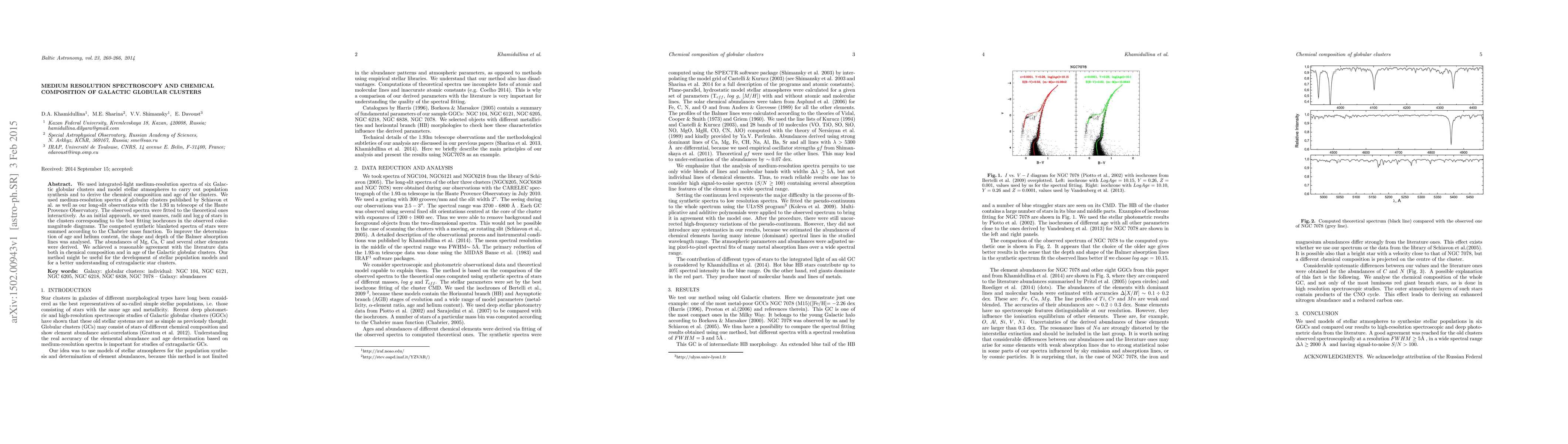 We used integrated-light medium-resolution spectra of six Galactic globular clusters and model stellar atmospheres to carry out population synthesis and to derive chemical composition and age of the clusters. We used medium-resolution spectra of globular clusters published by Schiavon et al. (2005), as well as our long-slit observations with the 1.93 m telescope of the Haute Provence Observatory. The observed spectra were fitted to the theoretical ones interactively. As an initial approach, we used masses, radii and log g of stars in the clusters corresponding to the best fitting isochrones in the observed color-magnitude diagrams. The computed synthetic blanketed spectra of stars were summed according to the Chabrier mass function. To improve the determination of age and helium content, the shape and depth of the Balmer absorption lines was analysed. The abundances of Mg, Ca, C and several other elements were derived. A reasonable agreement with the literature data both in chemical composition and in age of the clusters is found. Our method might be useful for the development of stellar population models and for a better understanding of extragalactic star clusters.