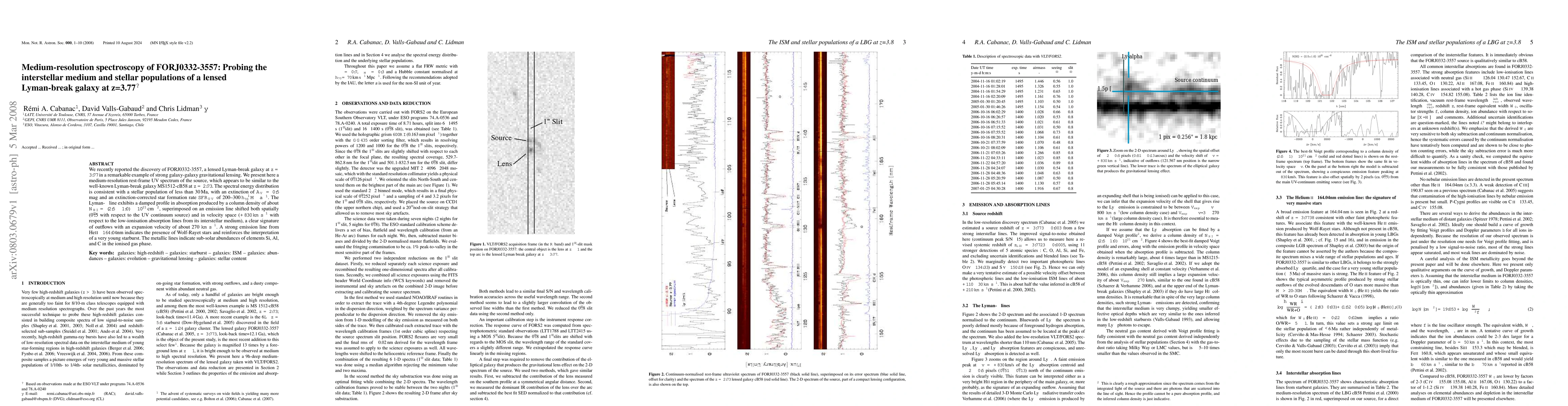 This paper presents a medium-resolution spectroscopy of FORJ0332-3557, a lensed Lyman-break galaxy at z=3.77, revealing young stellar populations, outflows, and Wolf-Rayet stars with sub-solar metal abundances.