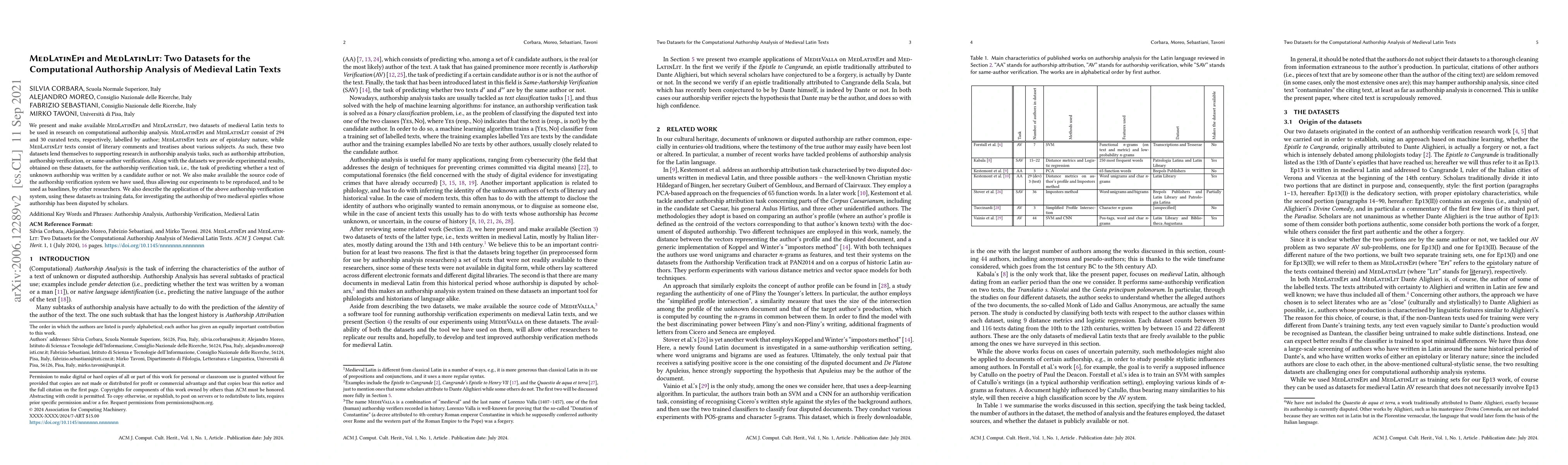 Two datasets, MedLatinEpi and MedLatinLit, have been created to support research on computational authorship analysis of medieval Latin texts. The datasets include 294 and 30 curated texts labeled by author, with experimental results for authorship verification tasks.