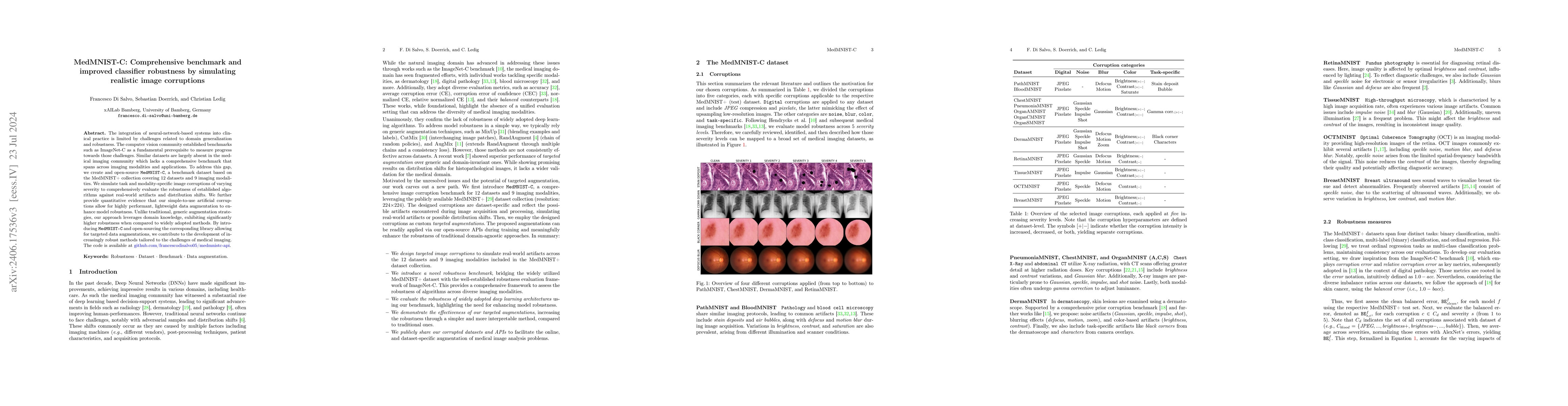 The paper introduces MedMNIST-C, a comprehensive benchmark dataset for evaluating robustness in medical imaging, covering 12 datasets and 9 imaging modalities. The authors simulate realistic image corruptions to test established algorithms' robustness against real-world artifacts and distribution shifts, demonstrating significant improvements over generic augmentation methods.