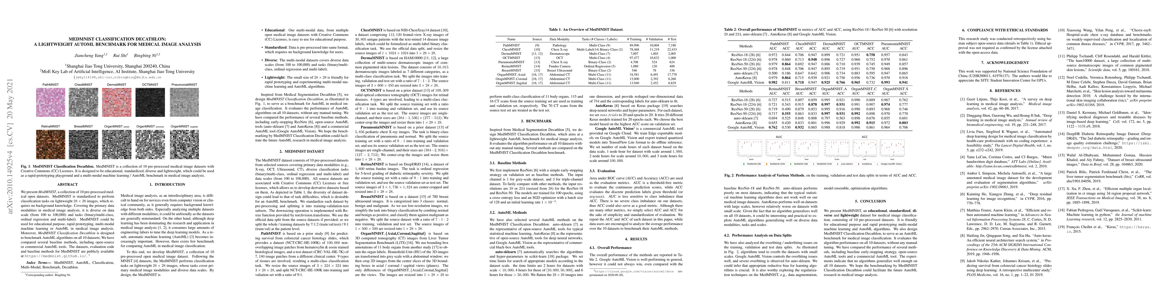 MedMNIST presents a collection of 10 standardized medical image datasets for classification tasks, facilitating educational and AutoML applications. The MedMNIST Classification Decathlon benchmarks AutoML algorithms across these datasets, with all resources publicly available for further research.