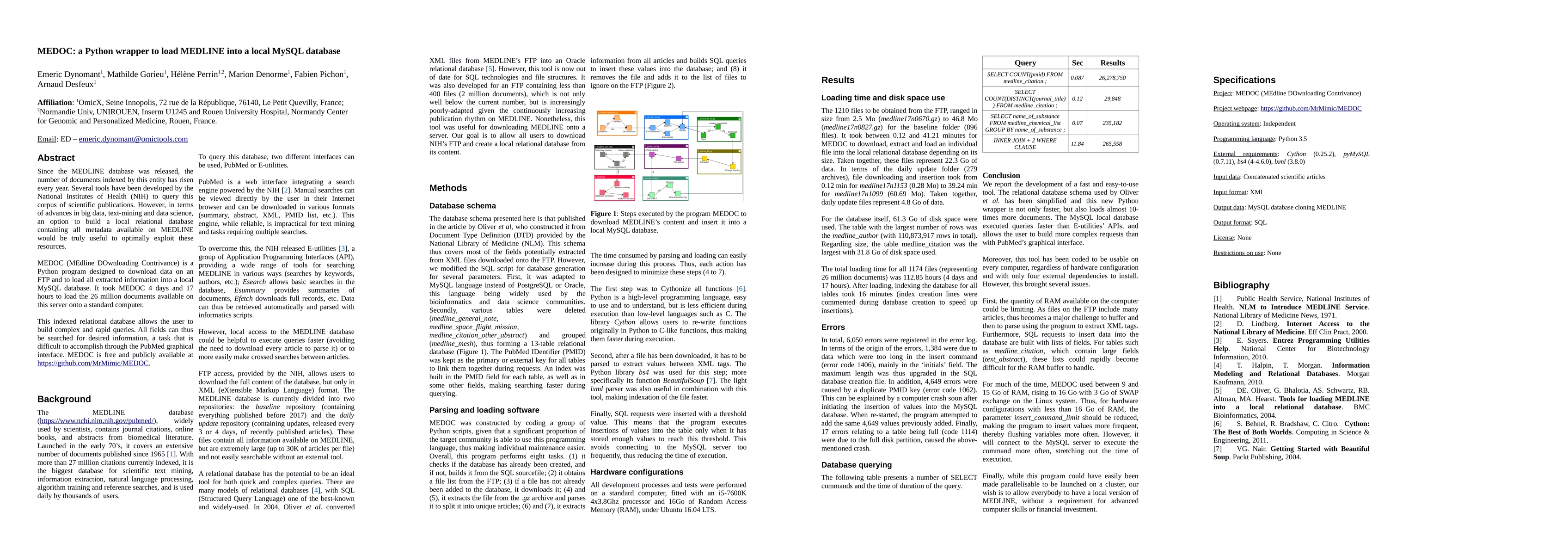 Since the MEDLINE database was released, the number of documents indexed by this entity has risen every year. Several tools have been developed by the National Institutes of Health (NIH) to query this corpus of scientific publications. However, in terms of advances in big data, text-mining and data science, an option to build a local relational database containing all metadata available on MEDLINE would be truly useful to optimally exploit these resources. MEDOC (MEdline DOwnloading Contrivance) is a Python program designed to download data on an FTP and to load all extracted information into a local MySQL database. It took MEDOC 4 days and 17 hours to load the 26 million documents available on this server onto a standard computer. This indexed relational database allows the user to build complex and rapid queries. All fields can thus be searched for desired information, a task that is difficult to accomplish through the PubMed graphical interface. MEDOC is free and publicly available at https://github.com/MrMimic/MEDOC.