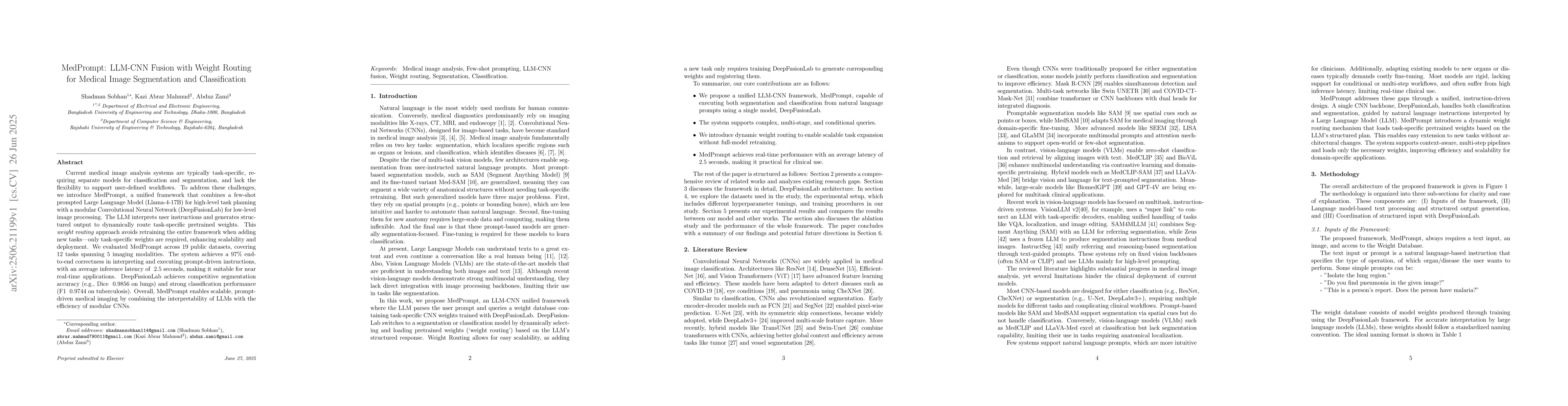The study introduces MedPrompt, a unified framework combining a few-shot prompted Large Language Model (Llama-4-17B) for high-level task planning with a modular CNN (DeepFusionLab) for low-level image processing, utilizing weight routing for task-specific model selection.