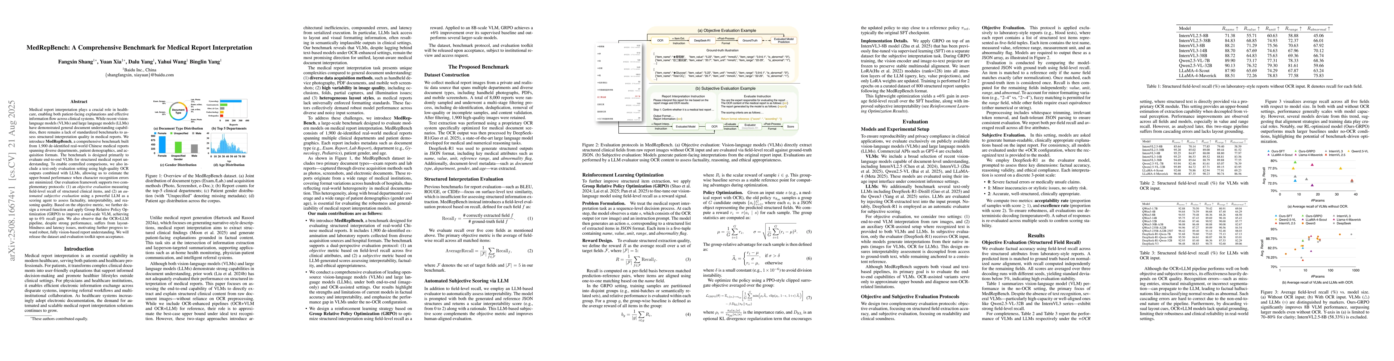 Medical report interpretation plays a crucial role in healthcare, enabling both patient-facing explanations and effective information flow across clinical systems. While recent vision-language models (VLMs) and large language models (LLMs) have demonstrated general document understanding capabilities, there remains a lack of standardized benchmarks to assess structured interpretation quality in medical reports. We introduce MedRepBench, a comprehensive benchmark built from 1,900 de-identified real-world Chinese medical reports spanning diverse departments, patient demographics, and acquisition formats. The benchmark is designed primarily to evaluate end-to-end VLMs for structured medical report understanding. To enable controlled comparisons, we also include a text-only evaluation setting using high-quality OCR outputs combined with LLMs, allowing us to estimate the upper-bound performance when character recognition errors are minimized. Our evaluation framework supports two complementary protocols: (1) an objective evaluation measuring field-level recall of structured clinical items, and (2) an automated subjective evaluation using a powerful LLM as a scoring agent to assess factuality, interpretability, and reasoning quality. Based on the objective metric, we further design a reward function and apply Group Relative Policy Optimization (GRPO) to improve a mid-scale VLM, achieving up to 6% recall gain. We also observe that the OCR+LLM pipeline, despite strong performance, suffers from layout-blindness and latency issues, motivating further progress toward robust, fully vision-based report understanding.
