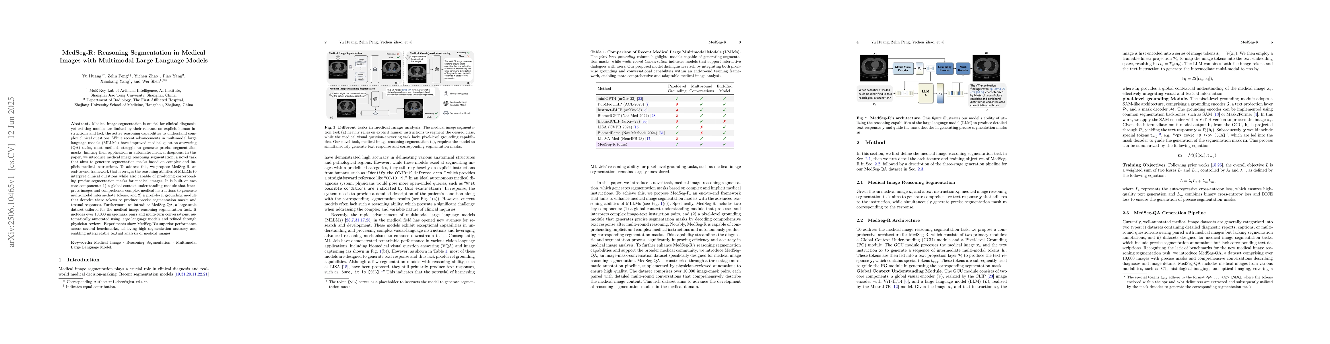 Medical image segmentation is crucial for clinical diagnosis, yet existing models are limited by their reliance on explicit human instructions and lack the active reasoning capabilities to understand complex clinical questions. While recent advancements in multimodal large language models (MLLMs) have improved medical question-answering (QA) tasks, most methods struggle to generate precise segmentation masks, limiting their application in automatic medical diagnosis. In this paper, we introduce medical image reasoning segmentation, a novel task that aims to generate segmentation masks based on complex and implicit medical instructions. To address this, we propose MedSeg-R, an end-to-end framework that leverages the reasoning abilities of MLLMs to interpret clinical questions while also capable of producing corresponding precise segmentation masks for medical images. It is built on two core components: 1) a global context understanding module that interprets images and comprehends complex medical instructions to generate multi-modal intermediate tokens, and 2) a pixel-level grounding module that decodes these tokens to produce precise segmentation masks and textual responses. Furthermore, we introduce MedSeg-QA, a large-scale dataset tailored for the medical image reasoning segmentation task. It includes over 10,000 image-mask pairs and multi-turn conversations, automatically annotated using large language models and refined through physician reviews. Experiments show MedSeg-R's superior performance across several benchmarks, achieving high segmentation accuracy and enabling interpretable textual analysis of medical images.