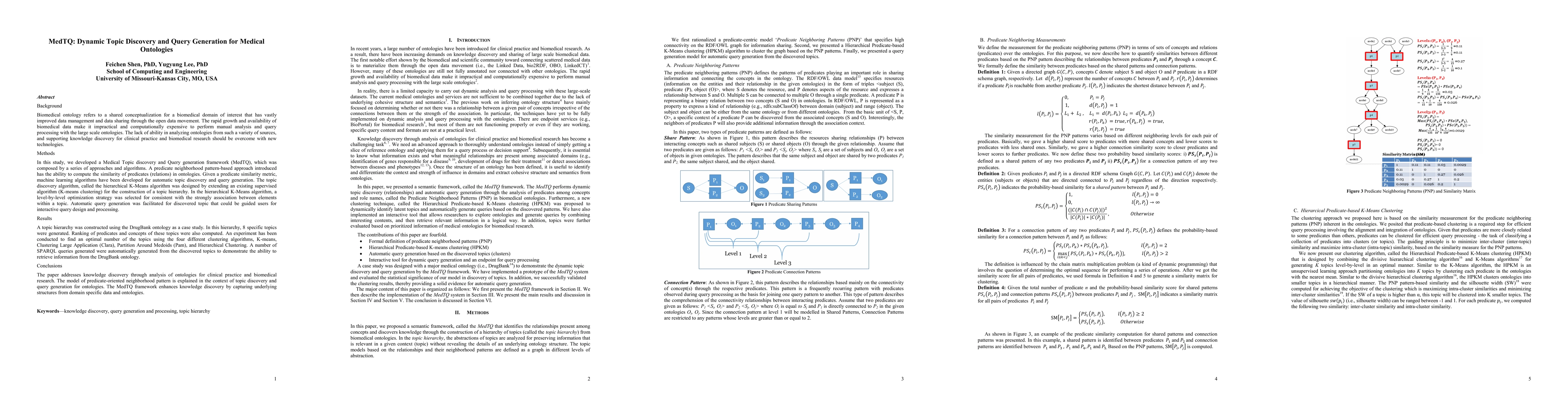 Biomedical ontology refers to a shared conceptualization for a biomedical domain of interest that has vastly improved data management and data sharing through the open data movement. The rapid growth and availability of biomedical data make it impractical and computationally expensive to perform manual analysis and query processing with the large scale ontologies. The lack of ability in analyzing ontologies from such a variety of sources, and supporting knowledge discovery for clinical practice and biomedical research should be overcome with new technologies. In this study, we developed a Medical Topic discovery and Query generation framework (MedTQ), which was composed by a series of approaches and algorithms. A predicate neighborhood pattern-based approach introduced has the ability to compute the similarity of predicates (relations) in ontologies. Given a predicate similarity metric, machine learning algorithms have been developed for automatic topic discovery and query generation. The topic discovery algorithm, called the hierarchical K-Means algorithm was designed by extending an existing supervised algorithm (K-means clustering) for the construction of a topic hierarchy. In the hierarchical K-Means algorithm, a level-by-level optimization strategy was selected for consistent with the strongly association between elements within a topic. Automatic query generation was facilitated for discovered topic that could be guided users for interactive query design and processing. Evaluation was conducted to generate topic hierarchy for DrugBank ontology as a case study. Results demonstrated that the MedTQ framework can enhance knowledge discovery by capturing underlying structures from domain specific data and ontologies.