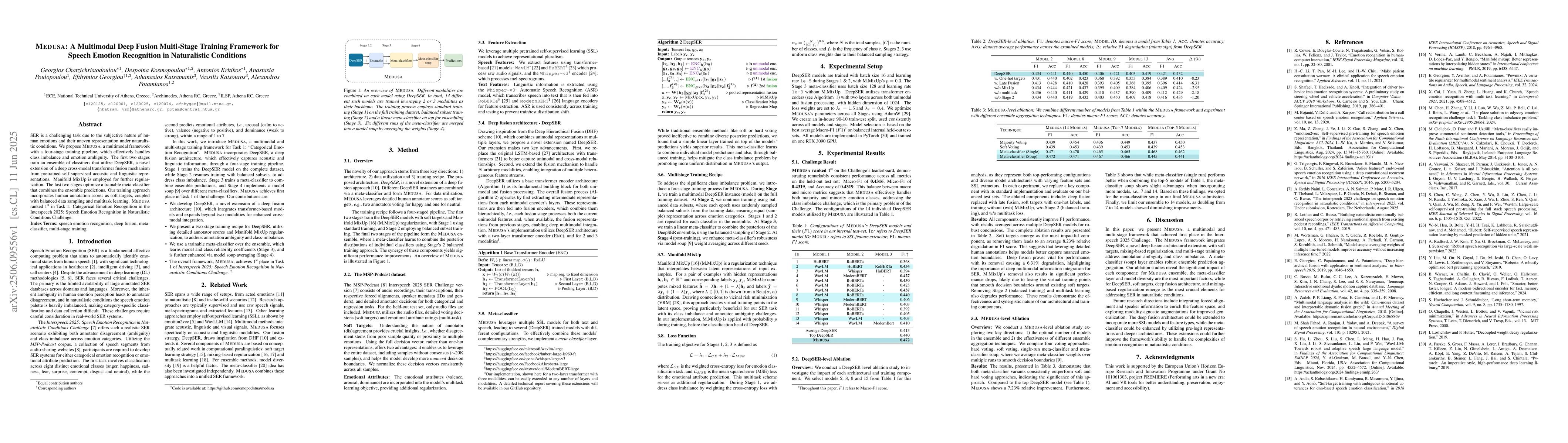 SER is a challenging task due to the subjective nature of human emotions and their uneven representation under naturalistic conditions. We propose MEDUSA, a multimodal framework with a four-stage training pipeline, which effectively handles class imbalance and emotion ambiguity. The first two stages train an ensemble of classifiers that utilize DeepSER, a novel extension of a deep cross-modal transformer fusion mechanism from pretrained self-supervised acoustic and linguistic representations. Manifold MixUp is employed for further regularization. The last two stages optimize a trainable meta-classifier that combines the ensemble predictions. Our training approach incorporates human annotation scores as soft targets, coupled with balanced data sampling and multitask learning. MEDUSA ranked 1st in Task 1: Categorical Emotion Recognition in the Interspeech 2025: Speech Emotion Recognition in Naturalistic Conditions Challenge.