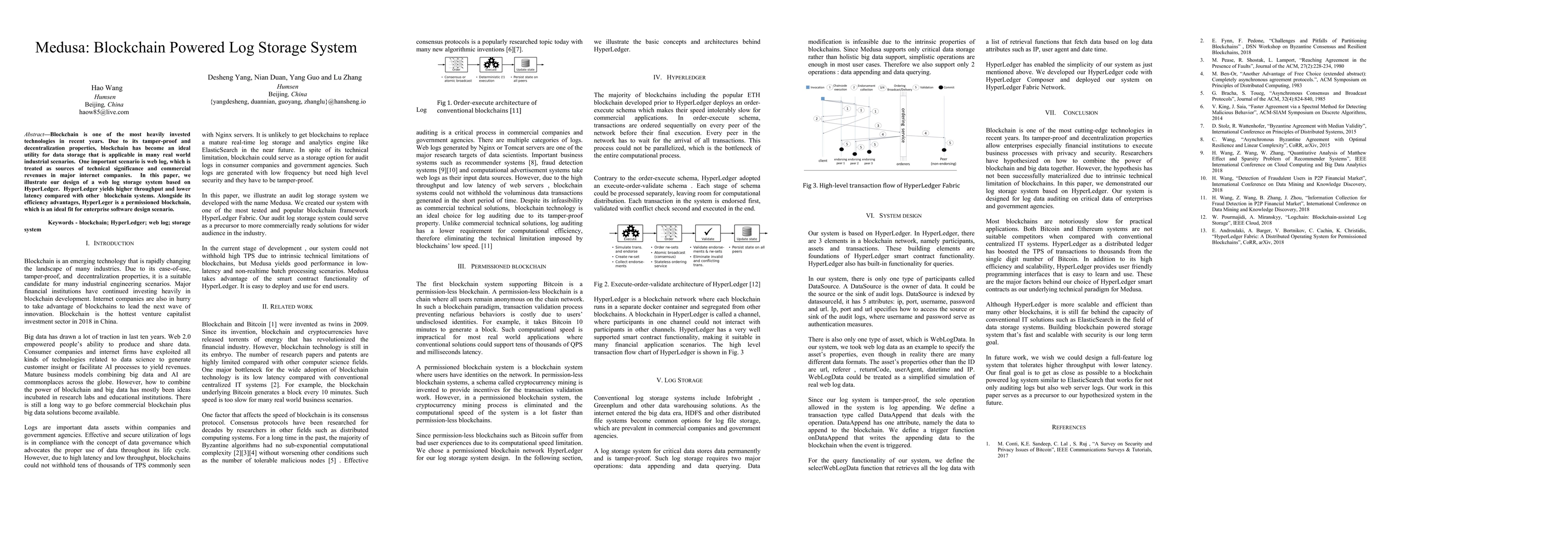 This paper presents Medusa, a blockchain-powered web log storage system built on Hyperledger. It offers high throughput, low latency, and is suitable for enterprise software due to its permissioned nature, addressing the need for secure, decentralized log storage in industrial scenarios.
