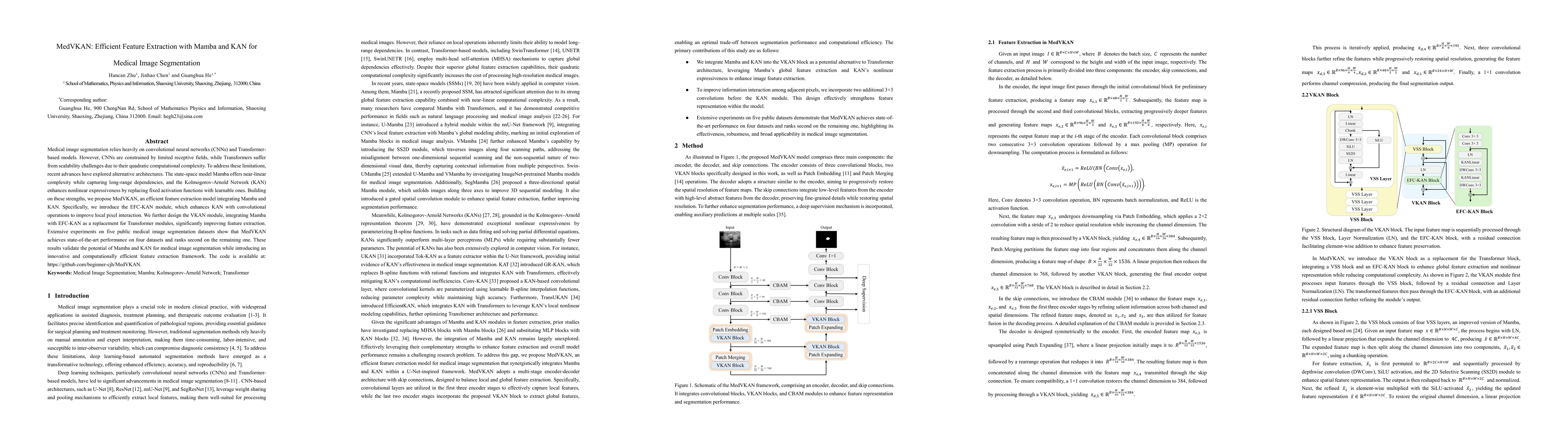 The research proposes MedVKAN, an efficient feature extraction model that integrates Mamba and KAN for medical image segmentation. It introduces the EFC-KAN module, enhancing KAN with convolutional operations, and the VKAN module, integrating Mamba with EFC-KAN as a Transformer replacement.