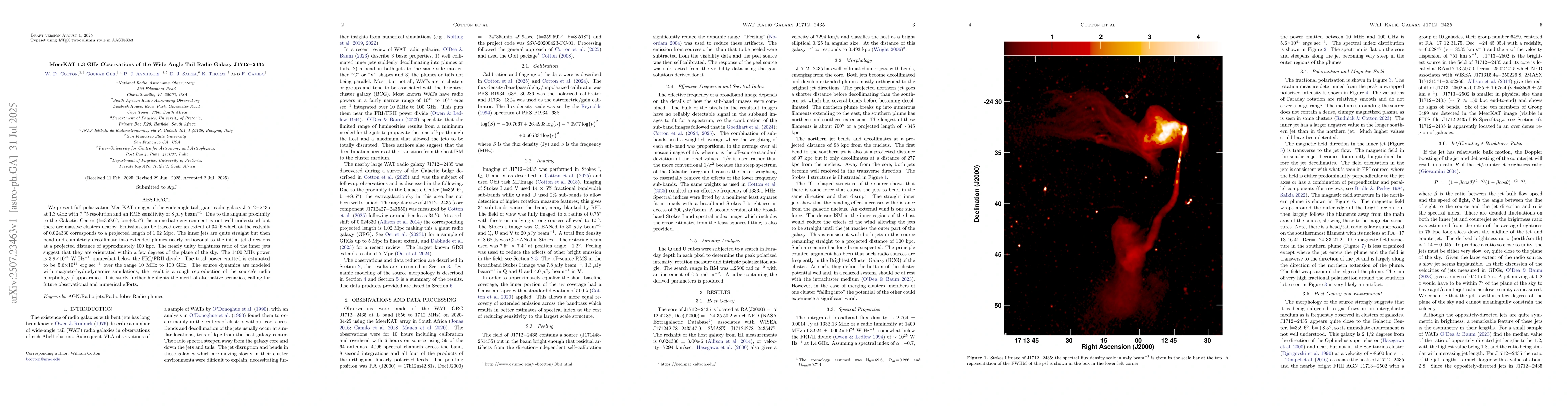 We present full polarization MeerKAT images of the wide-angle tail, giant radio galaxy J1712$-$2435 at 1.3 GHz with 7.\asec5 resolution and an RMS sensitivity of 8 $\mu$Jy beam$^{-1}$. Due to the angular proximity to the Galactic Center (l=359.6$^\circ$, b=+8.5$^\circ$) the immediate environment is not well understood but there are massive clusters nearby. Emission can be traced over an extent of 34.\amin6 which at the redshift of 0.024330 corresponds to a projected length of 1.02 Mpc. The inner jets are quite straight but then bend and completely decollimate into extended plumes nearly orthogonal to the initial jet directions at a projected distance of approximately 100 kpc. The nearly unity brightness ratio of the inner jets suggest that they are orientated within a few degrees of the plane of the sky. The 1400 MHz power is 3.9$\times 10^{24}$ W Hz$^{-1}$, somewhat below the FRI/FRII divide. The total power emitted is estimated to be 5.6$\times 10^{41}$ erg sec$^{-1}$ over the range 10 MHz to 100 GHz. The source dynamics are modeled with magneto-hydrodynamics simulations; the result is a rough reproduction of the source's radio morphology / appearance. This study further highlights the merit of alternative scenarios, calling for future observational and numerical efforts.