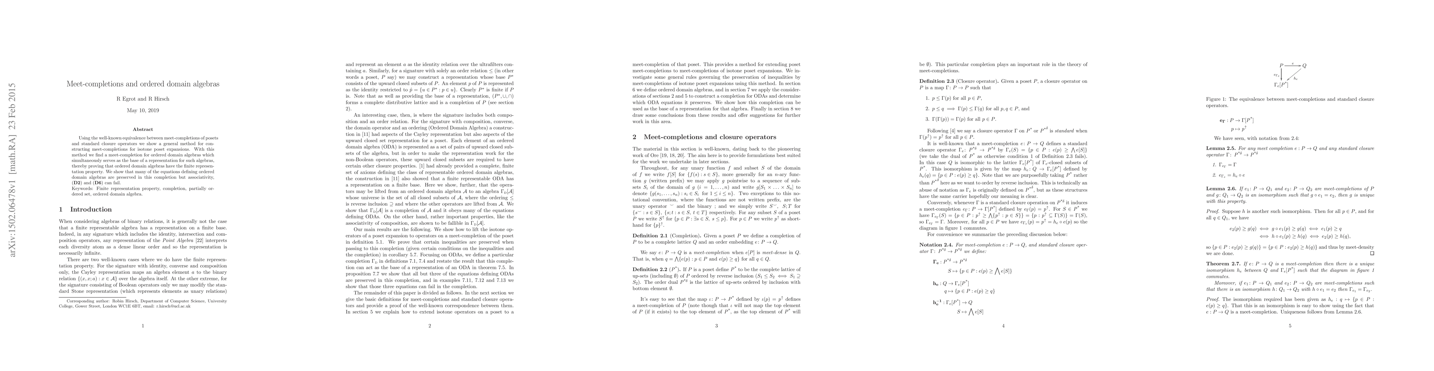 Summary: This paper develops a method for constructing meet-completions for isotone poset expansions, specifically applying it to ordered domain algebras, proving their finite representation property. It shows that while many defining equations hold, associativity may not.