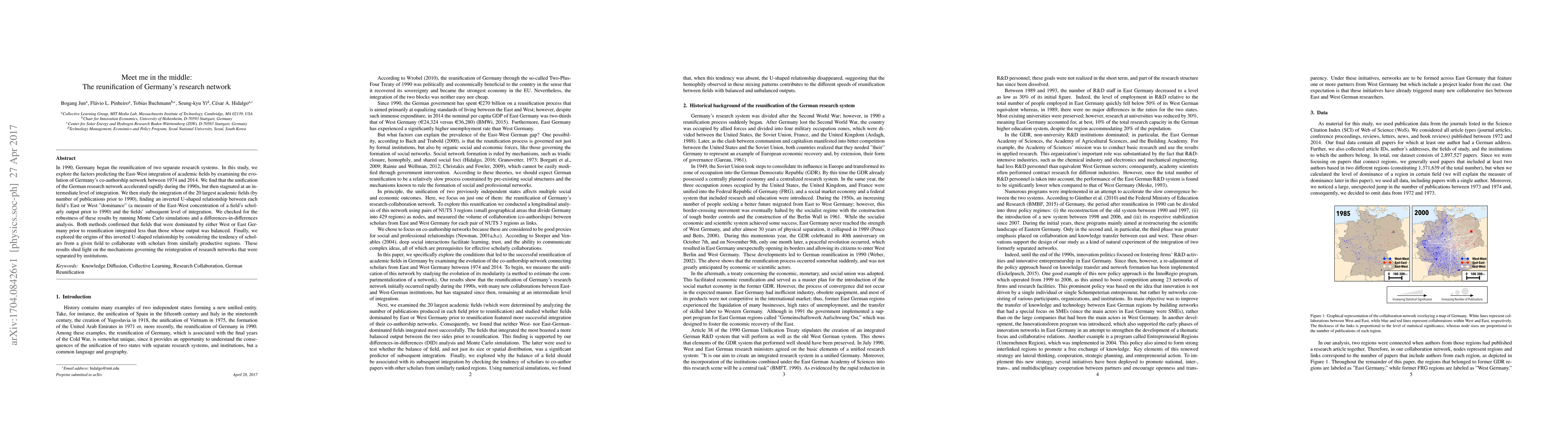 In 1990, Germany began the reunification of two separate research systems. In this study, we explore the factors predicting the East-West integration of academic fields by examining the evolution of Germany's co-authorship network between 1974 and 2014. We find that the unification of the German research network accelerated rapidly during the 1990s, but then stagnated at an intermediate level of integration. We then study the integration of the 20 largest academic fields (by number of publications prior to 1990), finding an inverted U-shaped relationship between each field's East or West "dominance" (a measure of the East-West concentration of a field's scholarly output prior to 1990) and the fields' subsequent level of integration. We checked for the robustness of these results by running Monte Carlo simulations and a differences-in-differences analysis. Both methods confirmed that fields that were dominated by either West or East Germany prior to reunification integrated less than those whose output was balanced. Finally, we explored the origins of this inverted U-shaped relationship by considering the tendency of scholars from a given field to collaborate with scholars from similarly productive regions. These results shed light on the mechanisms governing the reintegration of research networks that were separated by institutions.