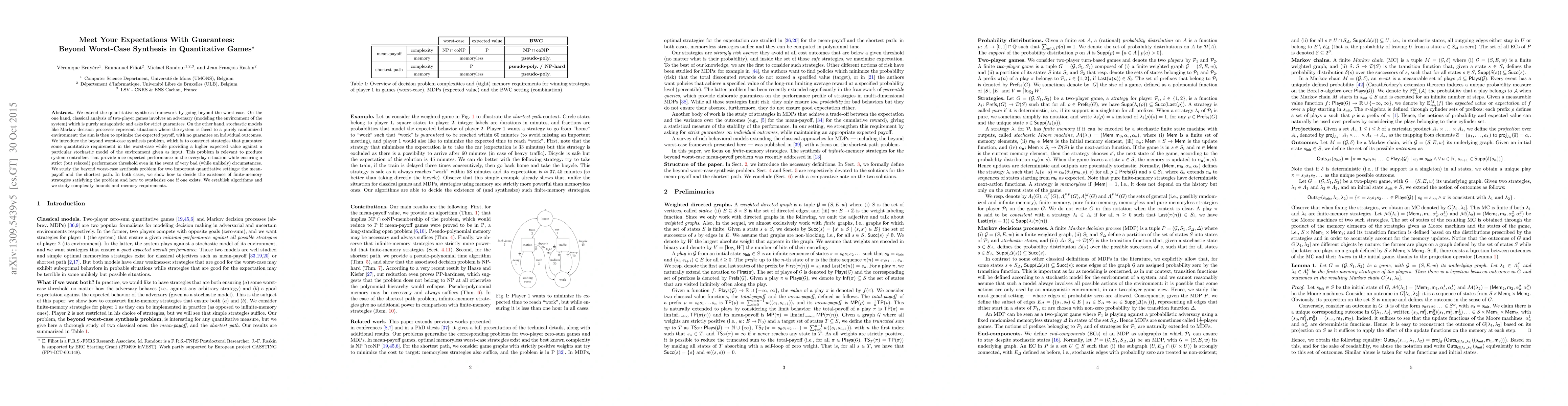 This paper introduces the beyond worst-case synthesis problem, aiming to construct strategies that guarantee quantitative performance in the worst-case while optimizing expected payoffs under a stochastic environment. The study focuses on mean-payoff and shortest path settings, providing algorithms for deciding and synthesizing such strategies.