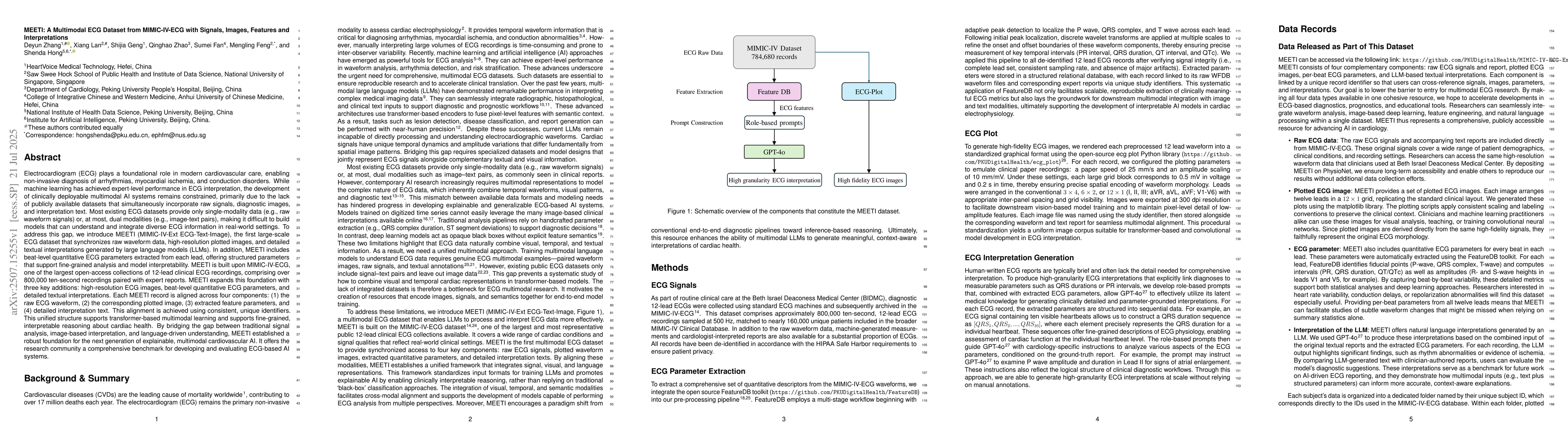 Electrocardiogram (ECG) plays a foundational role in modern cardiovascular care, enabling non-invasive diagnosis of arrhythmias, myocardial ischemia, and conduction disorders. While machine learning has achieved expert-level performance in ECG interpretation, the development of clinically deployable multimodal AI systems remains constrained, primarily due to the lack of publicly available datasets that simultaneously incorporate raw signals, diagnostic images, and interpretation text. Most existing ECG datasets provide only single-modality data or, at most, dual modalities, making it difficult to build models that can understand and integrate diverse ECG information in real-world settings. To address this gap, we introduce MEETI (MIMIC-IV-Ext ECG-Text-Image), the first large-scale ECG dataset that synchronizes raw waveform data, high-resolution plotted images, and detailed textual interpretations generated by large language models. In addition, MEETI includes beat-level quantitative ECG parameters extracted from each lead, offering structured parameters that support fine-grained analysis and model interpretability. Each MEETI record is aligned across four components: (1) the raw ECG waveform, (2) the corresponding plotted image, (3) extracted feature parameters, and (4) detailed interpretation text. This alignment is achieved using consistent, unique identifiers. This unified structure supports transformer-based multimodal learning and supports fine-grained, interpretable reasoning about cardiac health. By bridging the gap between traditional signal analysis, image-based interpretation, and language-driven understanding, MEETI established a robust foundation for the next generation of explainable, multimodal cardiovascular AI. It offers the research community a comprehensive benchmark for developing and evaluating ECG-based AI systems.