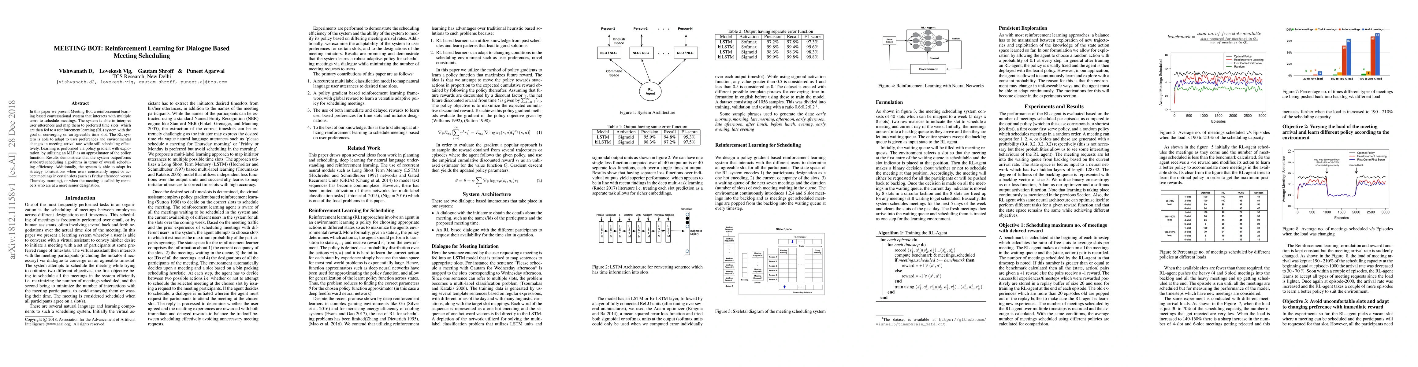 In this paper we present Meeting Bot, a reinforcement learning based conversational system that interacts with multiple users to schedule meetings. The system is able to interpret user utterences and map them to preferred time slots, which are then fed to a reinforcement learning (RL) system with the goal of converging on an agreeable time slot. The RL system is able to adapt to user preferences and environmental changes in meeting arrival rate while still scheduling effectively. Learning is performed via policy gradient with exploration, by utilizing an MLP as an approximator of the policy function. Results demonstrate that the system outperforms standard scheduling algorithms in terms of overall scheduling efficiency. Additionally, the system is able to adapt its strategy to situations when users consistently reject or accept meetings in certain slots (such as Friday afternoon versus Thursday morning), or when the meeting is called by members who are at a more senior designation.