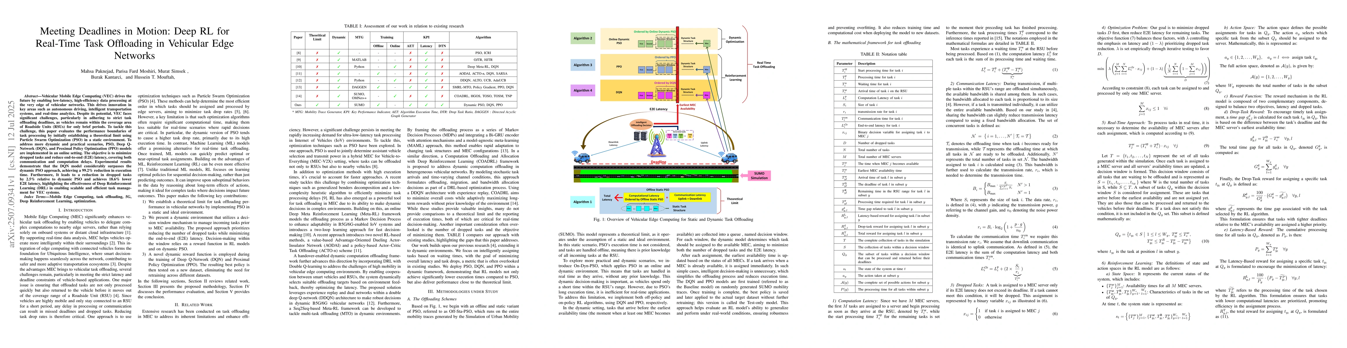 Vehicular Mobile Edge Computing (VEC) drives the future by enabling low-latency, high-efficiency data processing at the very edge of vehicular networks. This drives innovation in key areas such as autonomous driving, intelligent transportation systems, and real-time analytics. Despite its potential, VEC faces significant challenges, particularly in adhering to strict task offloading deadlines, as vehicles remain within the coverage area of Roadside Units (RSUs) for only brief periods. To tackle this challenge, this paper evaluates the performance boundaries of task processing by initially establishing a theoretical limit using Particle Swarm Optimization (PSO) in a static environment. To address more dynamic and practical scenarios, PSO, Deep Q-Network (DQN), and Proximal Policy Optimization (PPO) models are implemented in an online setting. The objective is to minimize dropped tasks and reduce end-to-end (E2E) latency, covering both communication and computation delays. Experimental results demonstrate that the DQN model considerably surpasses the dynamic PSO approach, achieving a 99.2% reduction in execution time. Furthermore, It leads to a reduction in dropped tasks by 2.5% relative to dynamic PSO and achieves 18.6\% lower E2E latency, highlighting the effectiveness of Deep Reinforcement Learning (DRL) in enabling scalable and efficient task management for VEC systems.