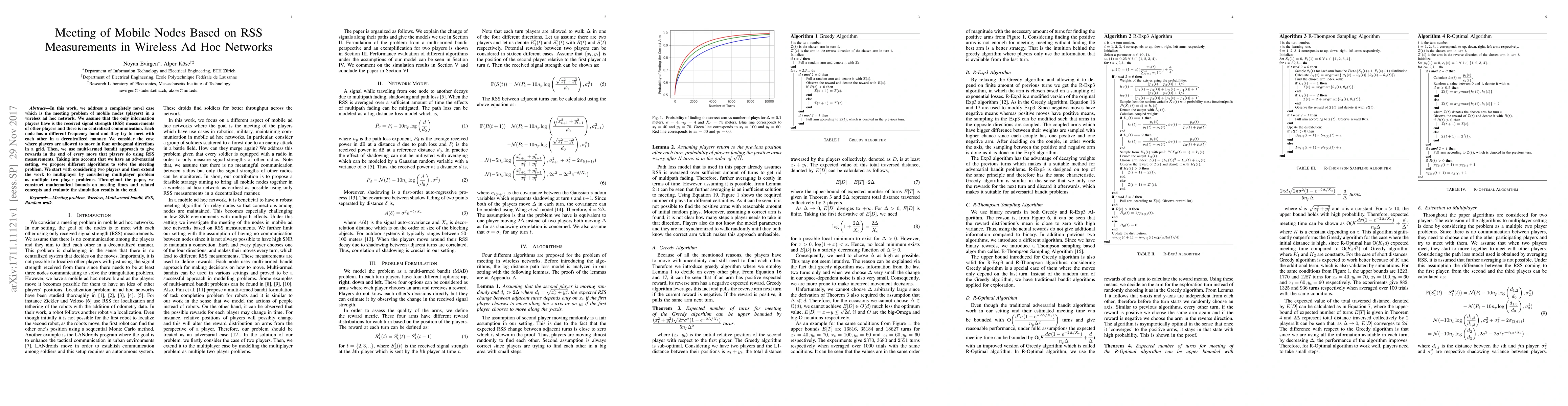 In this work, we address a completely novel case which is the meeting problem of mobile nodes (players) in a wireless ad hoc network. We assume that the only information players have is the received signal strength (RSS) measurements of other players and there is no centralized communication. Each node has a different frequency band and they try to meet with each other in a decentralized manner. We consider the case where players are allowed to move in four orthogonal directions in a grid. Then, we use multi-armed bandit approach to give rewards in the end of every move that players do using RSS measurements. Taking into account that we have an adversarial setting, we propose different algorithms to solve the meeting problem. We start with considering two players and then extend the work to multiplayer by considering multiplayer problem as multiple two player problems. Throughout the paper, we construct mathematical bounds on meeting times and related concepts and evaluate the simulation results in the end.