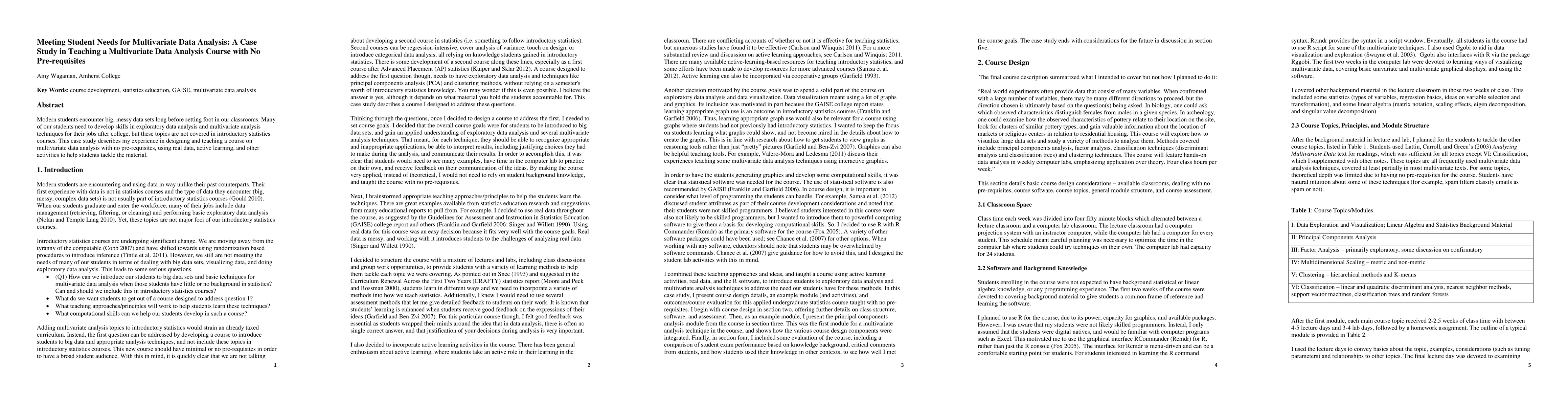Modern students encounter big, messy data sets long before setting foot in our classrooms. Many of our students need to develop skills in exploratory data analysis and multivariate analysis techniques for their jobs after college, but these topics are not covered in introductory statistics courses. This case study describes my experience in designing and teaching a course on multivariate data analysis with no pre-requisites, using real data, active learning, and other activities to help students tackle the material.