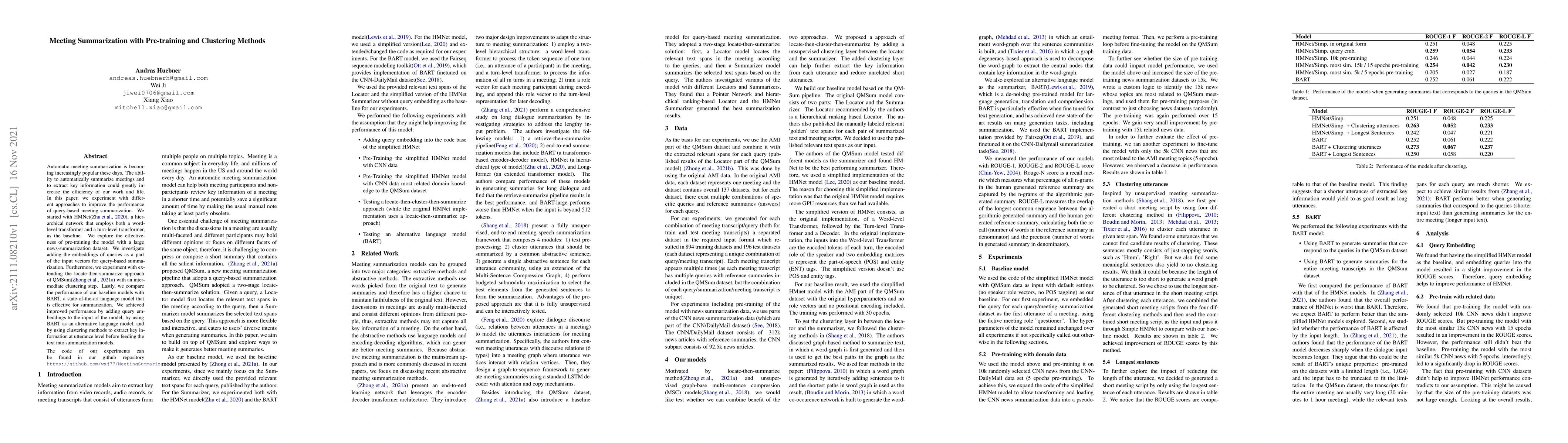 Researchers improved meeting summarization performance by pre-training models with large datasets and adding query embeddings, as well as using clustering methods to extract key information.