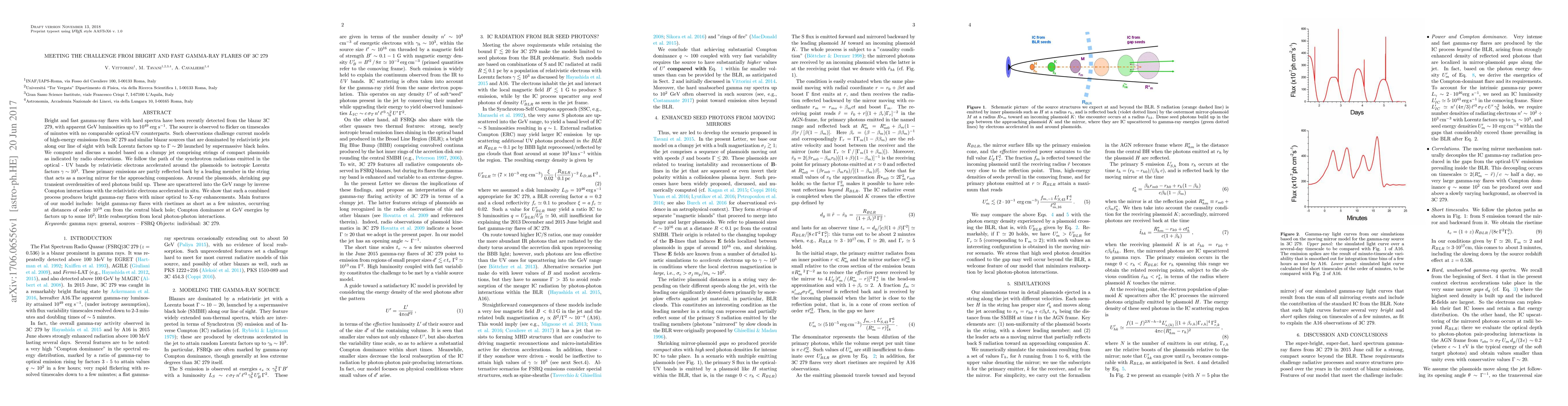Bright and fast gamma-ray flares with hard spectra have been recently detected from the blazar 3C 279, with apparent GeV luminosities up to $10^{49}$ erg/s. The source is observed to flicker on timescales of minutes with no comparable optical-UV counterparts. Such observations challenge current models of high-energy emissions from 3C 279 and similar blazar sources that are dominated by relativistic jets along our line of sight with bulk Lorentz factors up to $ \Gamma \sim 20$ launched by supermassive black holes. We compute and discuss a model based on a clumpy jet comprising strings of compact plasmoids as indicated by radio observations. We follow the path of the synchrotron radiations emitted in the optical - UV bands by relativistic electrons accelerated around the plasmoids to isotropic Lorentz factors $\gamma \sim 1000$. These primary emissions are partly reflected back by a leading member in the string that acts as a moving mirror for the approaching companions. Around the plasmoids, shrinking \emph{gap} transient overdensities of seed photons build up. These are upscattered into the GeV range by inverse Compton interactions with the relativistic electrons accelerated in situ. We show that such a combined process produces bright gamma-ray flares with minor optical to X-ray enhancements. Main features of our model include: bright gamma-ray flares with risetimes as short as a few minutes, occurring at distances of order $10^{18} $ cm from the central black hole; Compton dominance at GeV energies by factors up to some $10^2$; little reabsorption from local photon-photon interactions.