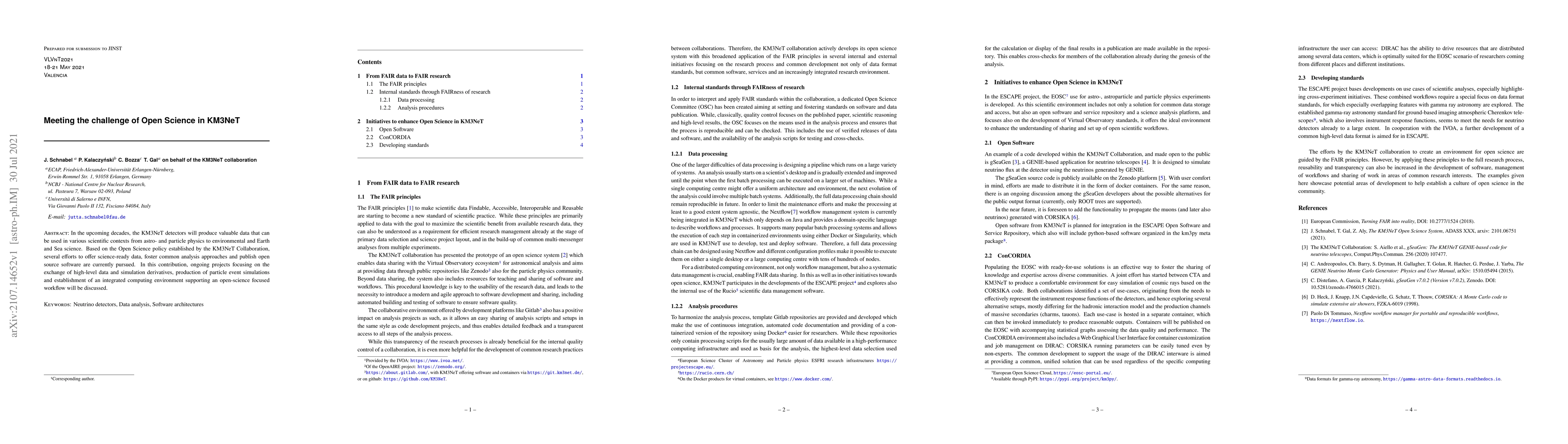 This paper discusses KM3NeT's initiatives to implement Open Science policies, focusing on sharing science-ready data, promoting collaborative analysis methods, and publishing open-source software to support diverse scientific research areas. It highlights ongoing projects for data exchange, simulation production, and an integrated computing environment.