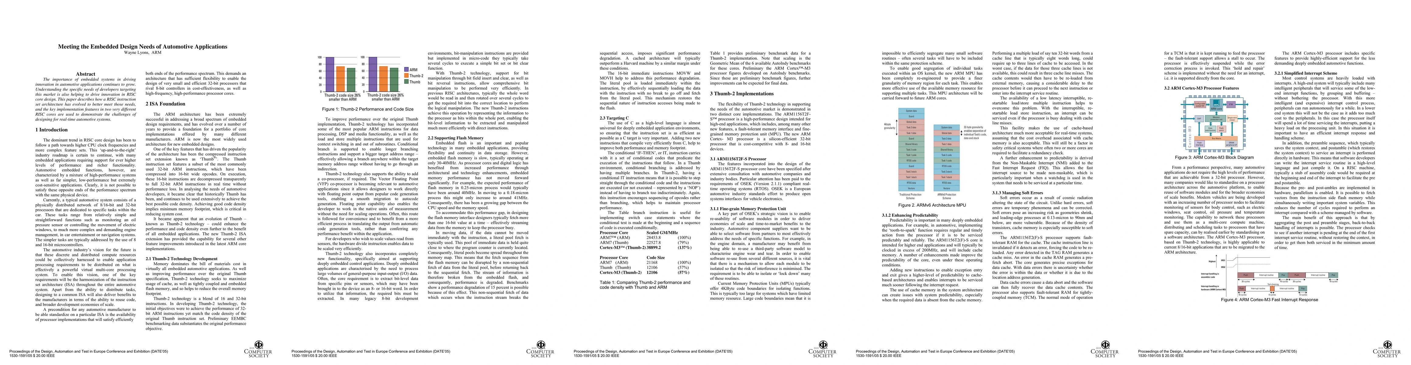 The importance of embedded systems in driving innovation in automotive applications continues to grow. Understanding the specific needs of developers targeting this market is also helping to drive innovation in RISC core design. This paper describes how a RISC instruction set architecture has evolved to better meet those needs, and the key implementation features in two very different RISC cores are used to demonstrate the challenges of designing for real-time automotive systems.