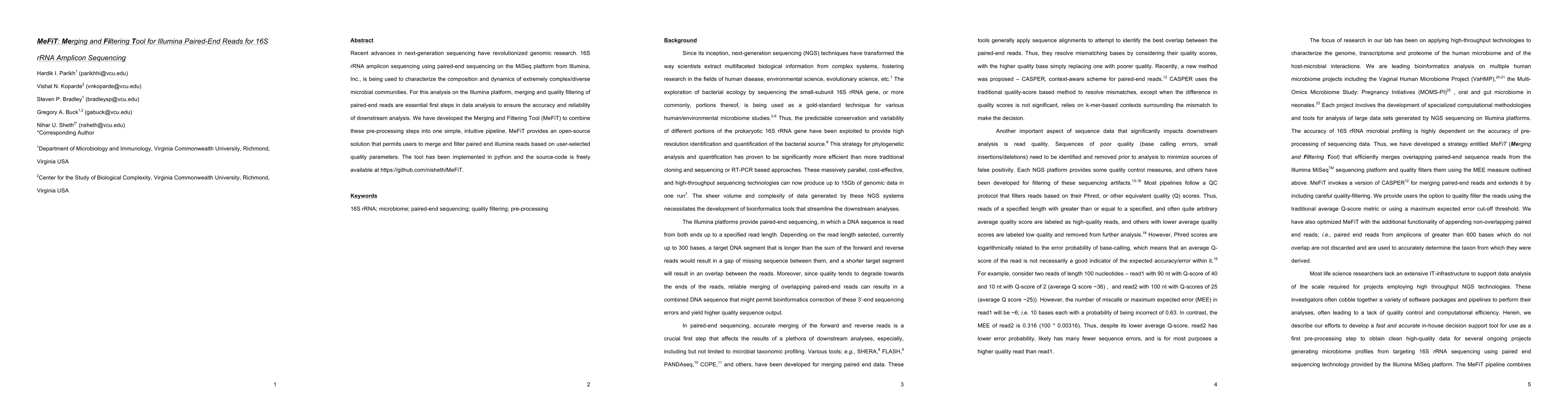MeFiT is an open-source Python tool designed to merge and filter paired-end reads from Illumina's MiSeq platform for 16S rRNA amplicon sequencing, ensuring accurate microbial community analysis. The tool is freely available on GitHub for user-defined quality parameter settings.