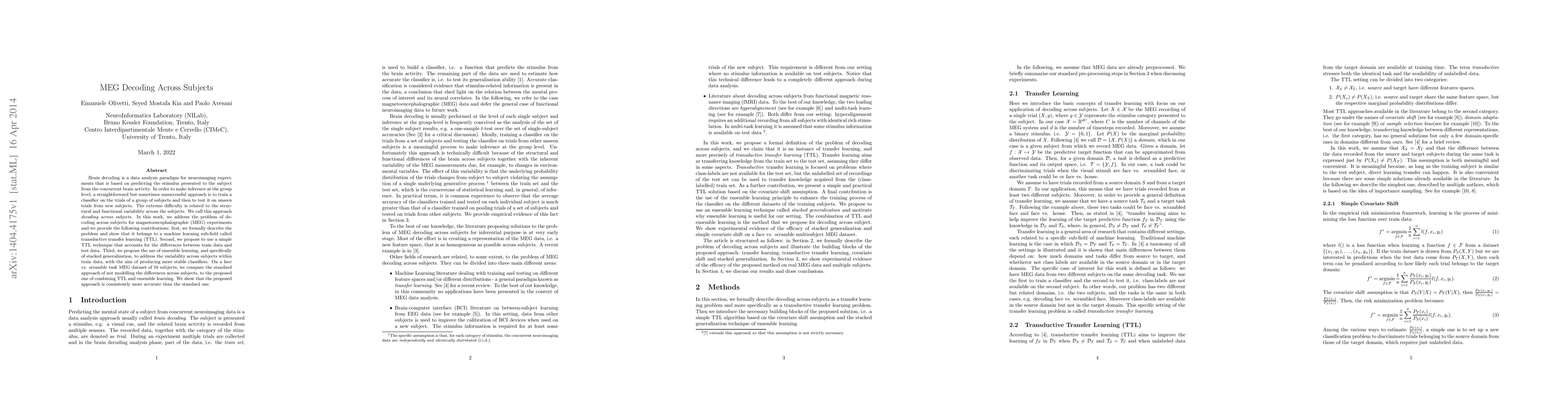This paper addresses the challenge of decoding brain activity across different subjects in MEG experiments using transductive transfer learning (TTL) and ensemble learning techniques. The proposed method, combining TTL and stacked generalization, outperforms traditional approaches in decoding accuracy on a face vs. scramble task dataset.
