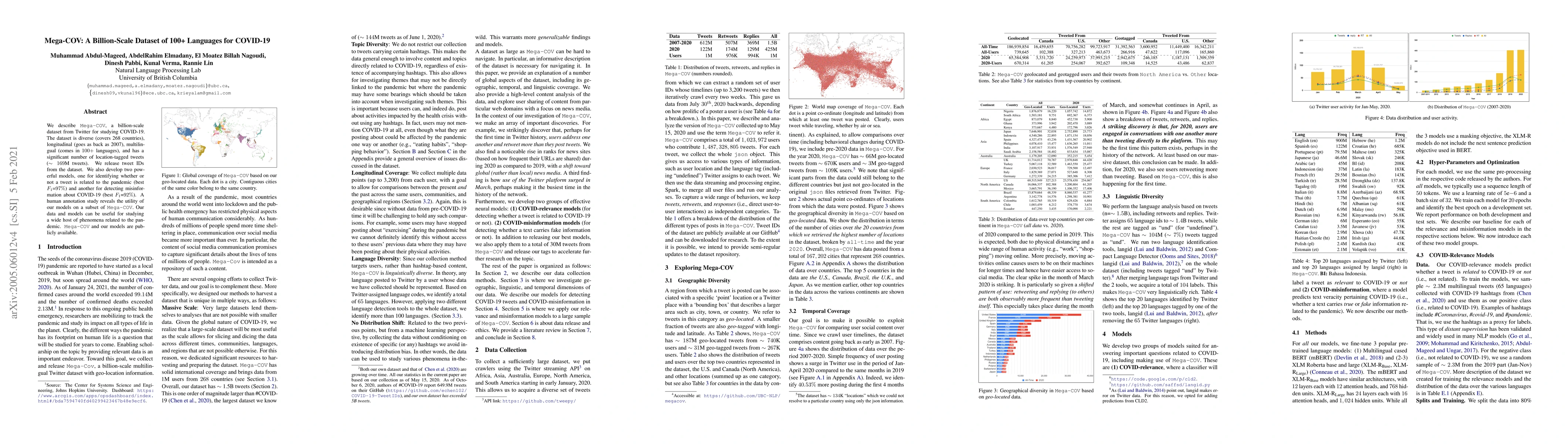 Mega-COV is a vast Twitter dataset covering 100+ languages and 268 countries, ideal for COVID-19 research, featuring 169M location-tagged tweets. The authors developed two models achieving high F1 scores for identifying pandemic-related tweets and detecting COVID-19 misinformation.