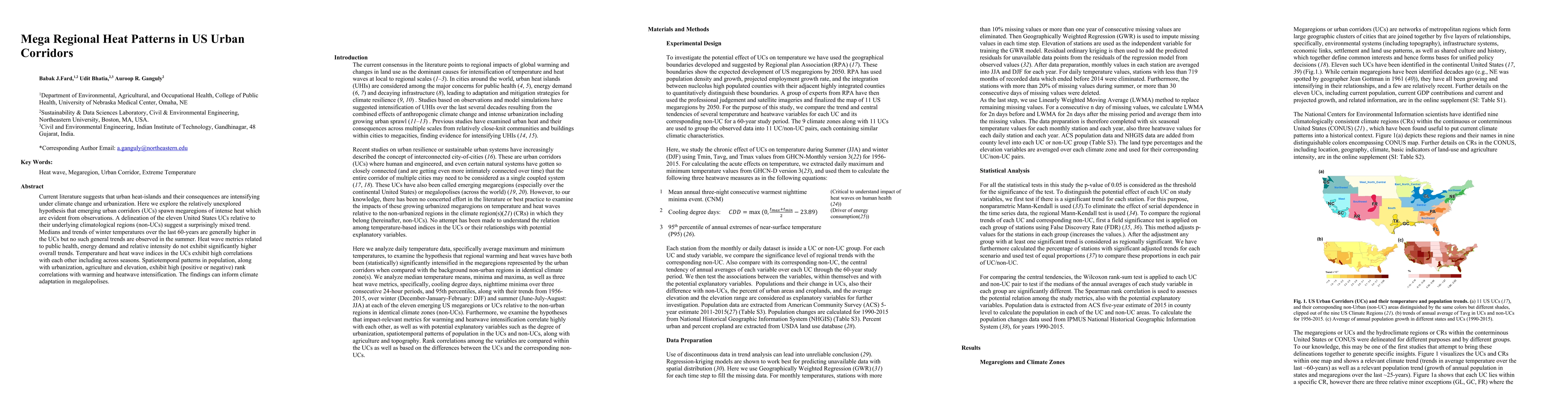 This study finds that emerging urban corridors in the US experience a mix of higher winter temperatures and no significant summer heat trends, with temperature correlations between seasons and variables like population growth and agriculture contributing to warming and heatwave intensification.