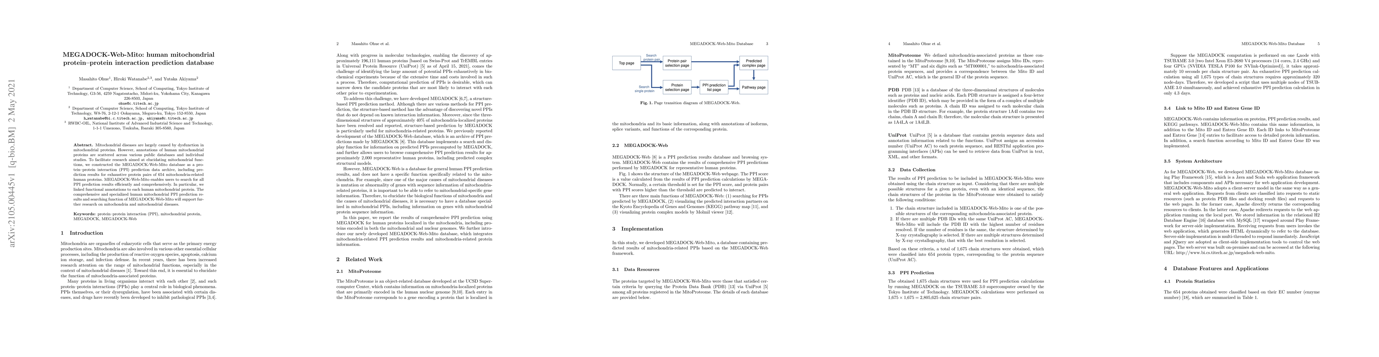 The MEGADOCK-Web-Mito database provides a comprehensive archive for human mitochondrial protein-protein interaction (PPI) predictions, facilitating research on mitochondrial functions and diseases by linking functional annotations to each protein. It offers efficient and comprehensive search capabilities for exhaustive PPI prediction results of 654 mitochondria-related human proteins.
