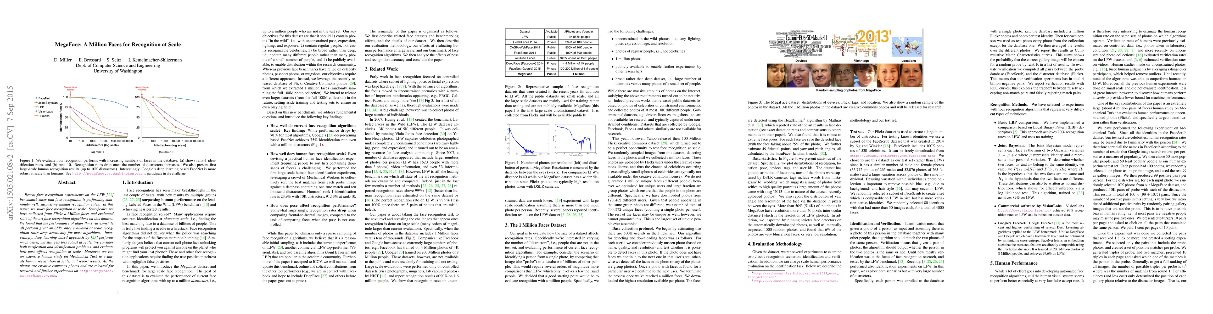 This paper investigates face recognition performance at a large scale using a dataset of one million faces collected from Flickr. It finds that while state-of-the-art algorithms perform well on smaller benchmarks, their effectiveness drops significantly when evaluated on this larger dataset, though deep learning approaches show some resilience.