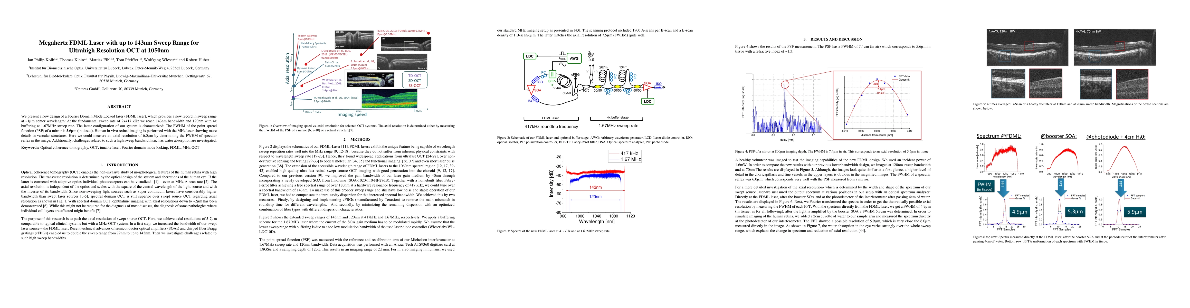 We present a new design of a Fourier Domain Mode Locked laser (FDML laser), which provides a new record in sweep range at ~1um center wavelength: At the fundamental sweep rate of 2x417 kHz we reach 143nm bandwidth and 120nm with 4x buffering at 1.67MHz sweep rate. The latter configuration of our system is characterized: The FWHM of the point spread function (PSF) of a mirror is 5.6um (in tissue). Human in vivo retinal imaging is performed with the MHz laser showing more details in vascular structures. Here we could measure an axial resolution of 6.0um by determining the FWHM of specular reflex in the image. Additionally, challenges related to such a high sweep bandwidth such as water absorption are investigated.