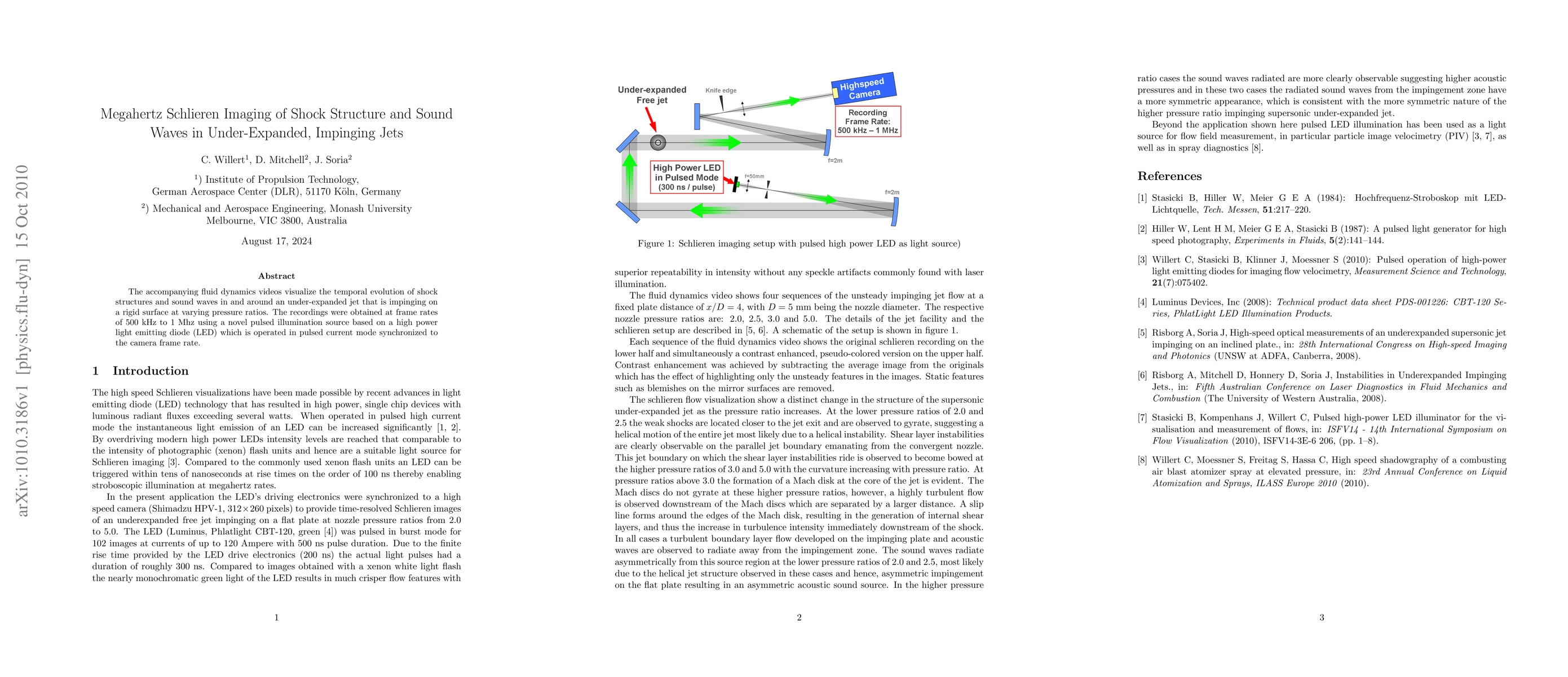 The accompanying fluid dynamics videos visualize the temporal evolution of shock structures and sound waves in and around an under-expanded jet that is impinging on a rigid surface at varying pressure ratios. The recordings were obtained at frame rates of 500 kHz to 1 Mhz using a novel pulsed illumination source based on a high power light emitting diode (LED) which is operated in pulsed current mode synchronized to the camera frame rate.