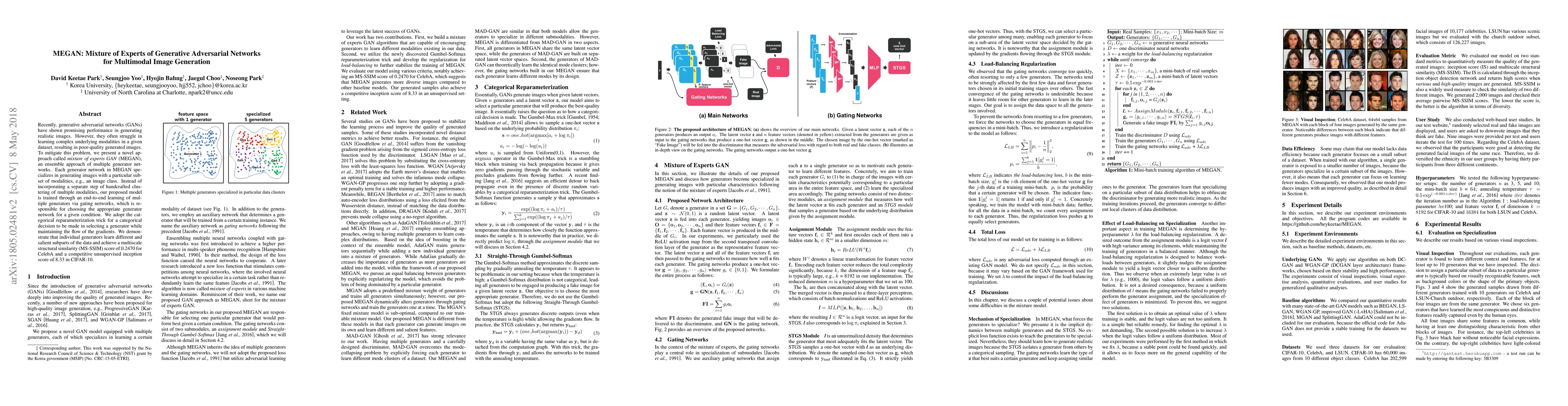 MEGAN, a mixture of experts GAN, employs multiple specialized generator networks to handle complex multimodal image generation, improving image quality. The model uses gating networks for end-to-end training and achieves competitive scores on CelebA and CIFAR-10 datasets.
