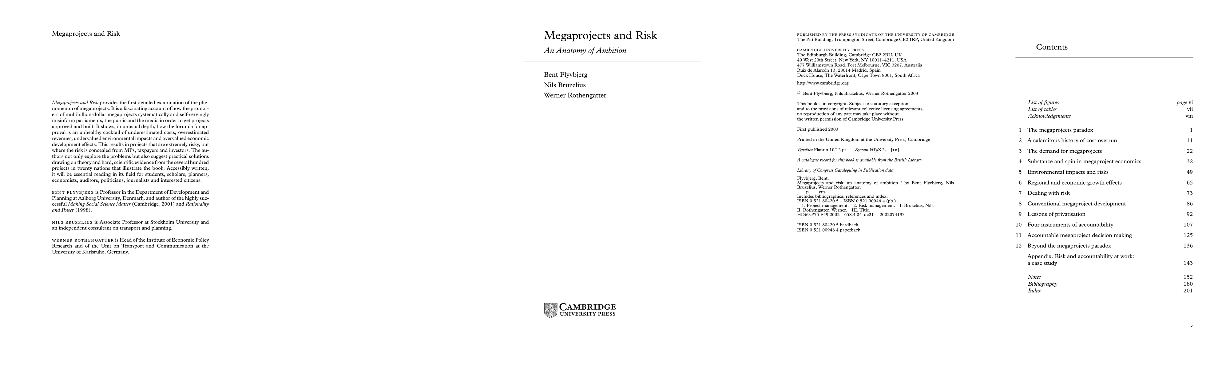 Back cover text: Megaprojects and Risk provides the first detailed examination of the phenomenon of megaprojects. It is a fascinating account of how the promoters of multibillion-dollar megaprojects systematically and self-servingly misinform parliaments, the public and the media in order to get projects approved and built. It shows, in unusual depth, how the formula for approval is an unhealthy cocktail of underestimated costs, overestimated revenues, undervalued environmental impacts and overvalued economic development effects. This results in projects that are extremely risky, but where the risk is concealed from MPs, taxpayers and investors. The authors not only explore the problems but also suggest practical solutions drawing on theory and hard, scientific evidence from the several hundred projects in twenty nations that illustrate the book. Accessibly written, it will be essential reading in its field for students, scholars, planners, economists, auditors, politicians, journalists and interested citizens.