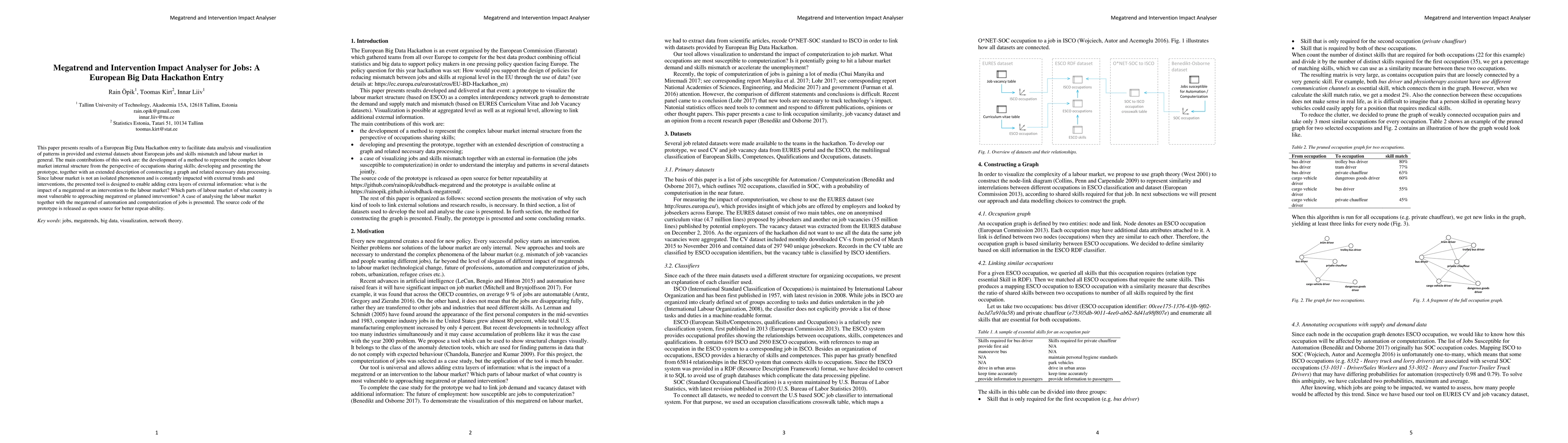 This paper presents results of a European Big Data Hackathon entry to facilitate data analysis and visualization of patterns in provided and external datasets about European jobs and skills mismatch and labour market in general. The main contributions of this work are: the development of a method to represent the complex labour market internal structure from the perspective of occupations sharing skills; developing and presenting the prototype, together with an extended description of constructing a graph and related necessary data processing. Since labour market is not an isolated phenomenon and is constantly impacted with external trends and interventions, the presented tool is designed to enable adding extra layers of external information: what is the impact of a megatrend or an intervention to the labour market? Which parts of labour market of what country is most vulnerable to approaching megatrend or planned intervention? A case of analysing the labour market together with the megatrend of automation and computerization of jobs is presented. The source code of the prototype is released as open source for better repeat-ability.