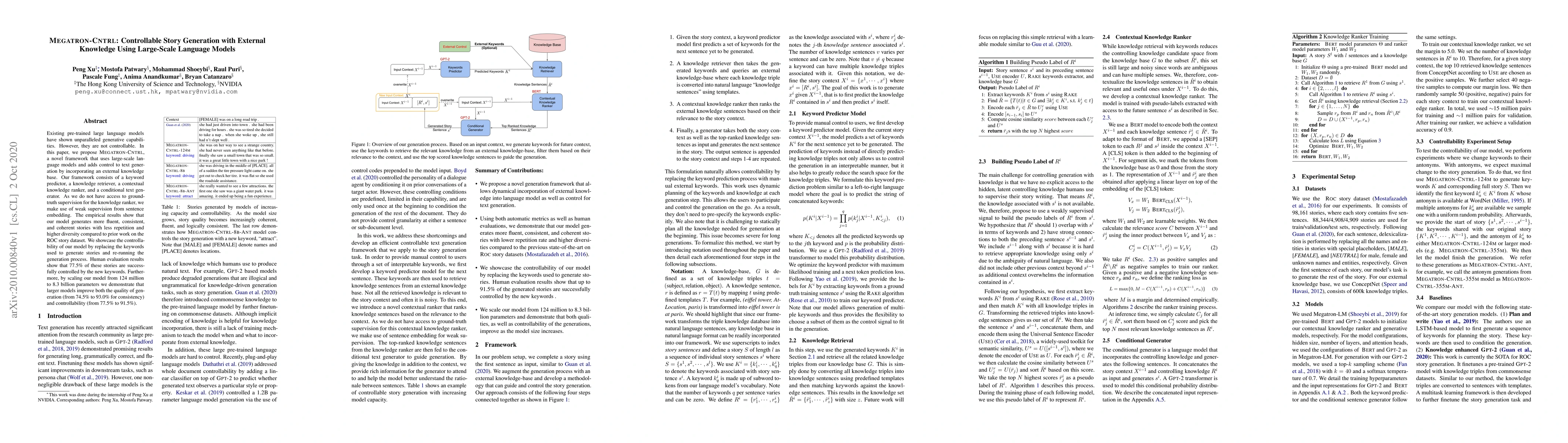 This paper introduces MEGATRON-CNTRL, a framework that enhances large-scale language models with control over story generation by integrating an external knowledge base. The model demonstrates improved fluency, consistency, and diversity in generated stories, with 77.5% of stories successfully controlled by new keywords, and larger models showing better performance in both quality and controllability.
