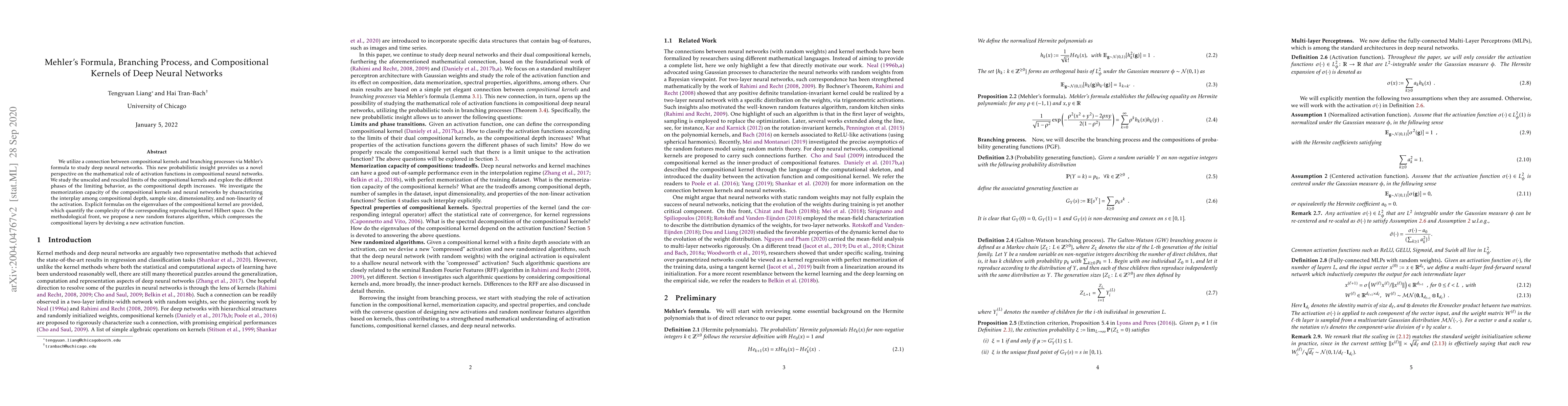 This paper connects compositional kernels and branching processes through Mehler's formula to analyze deep neural networks, revealing the mathematical role of activation functions. It explores the limiting behavior of compositional kernels and their memorization capacity, providing explicit formulas for the eigenvalues and proposing a new random features algorithm.