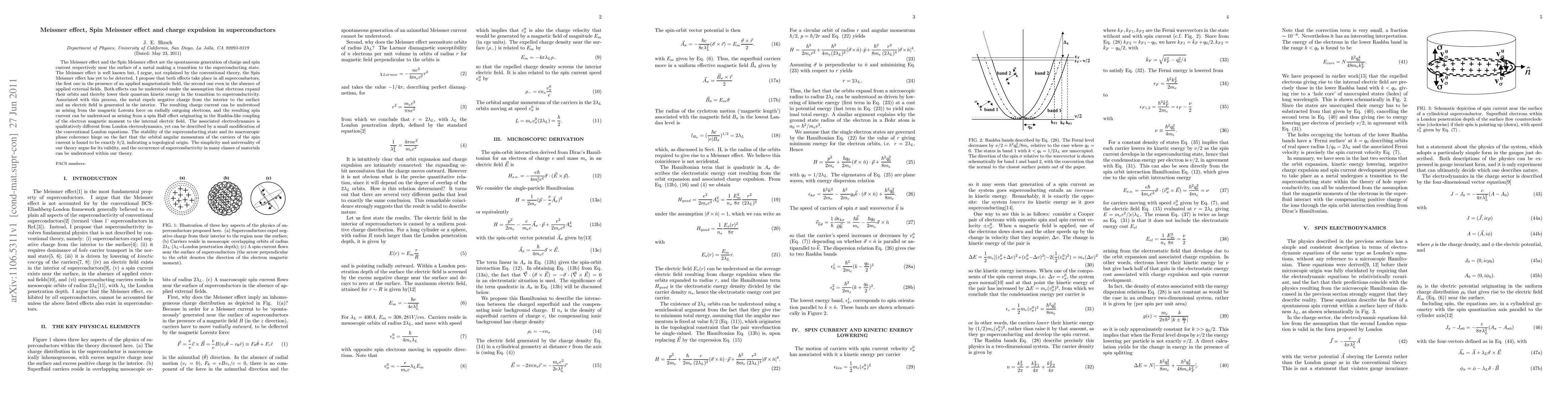 The Meissner effect and the Spin Meissner effect are the spontaneous generation of charge and spin current respectively near the surface of a metal making a transition to the superconducting state. The Meissner effect is well known but, I argue, not explained by the conventional theory, the Spin Meissner effect has yet to be detected. I propose that both effects take place in all superconductors, the first one in the presence of an applied magnetostatic field, the second one even in the absence of applied external fields. Both effects can be understood under the assumption that electrons expand their orbits and thereby lower their quantum kinetic energy in the transition to superconductivity. Associated with this process, the metal expels negative charge from the interior to the surface and an electric field is generated in the interior. The resulting charge current can be understood as arising from the magnetic Lorentz force on radially outgoing electrons, and the resulting spin current can be understood as arising from a spin Hall effect originating in the Rashba-like coupling of the electron magnetic moment to the internal electric field. The associated electrodynamics is qualitatively different from London electrodynamics, yet can be described by a small modification of the conventional London equations. The stability of the superconducting state and its macroscopic phase coherence hinge on the fact that the orbital angular momentum of the carriers of the spin current is found to be exactly $\hbar/2$, indicating a topological origin. The simplicity and universality of our theory argue for its validity, and the occurrence of superconductivity in many classes of materials can be understood within our theory.
