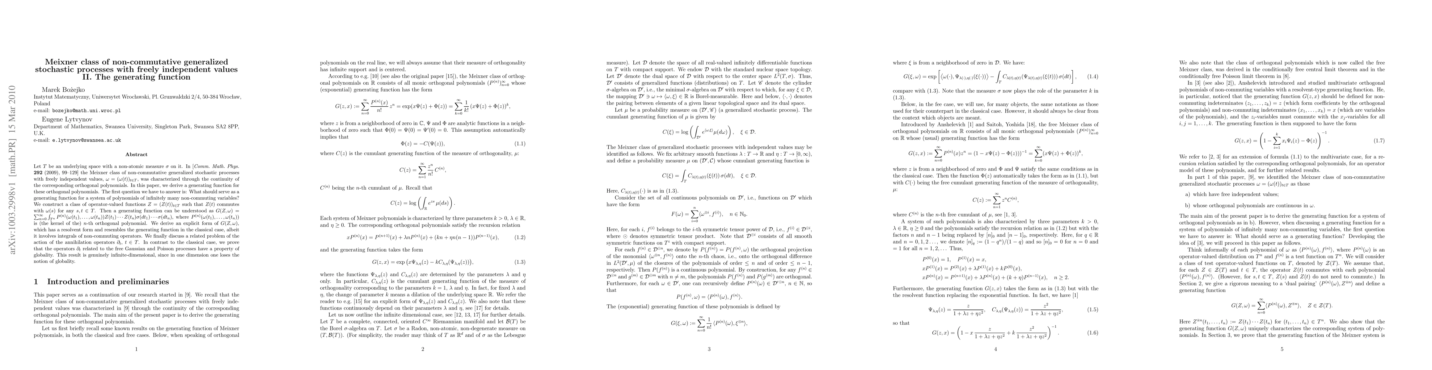 Let $T$ be an underlying space with a non-atomic measure $\sigma$ on it. In [{\it Comm.\ Math.\ Phys.}\ {\bf 292} (2009), 99--129] the Meixner class of non-commutative generalized stochastic processes with freely independent values, $\omega=(\omega(t))_{t\in T}$, was characterized through the continuity of the corresponding orthogonal polynomials. In this paper, we derive a generating function for these orthogonal polynomials. The first question we have to answer is: What should serve as a generating function for a system of polynomials of infinitely many non-commuting variables? We construct a class of operator-valued functions $Z=(Z(t))_{t\in T}$ such that $Z(t)$ commutes with $\omega(s)$ for any $s,t\in T$. Then a generating function can be understood as $G(Z,\omega)=\sum_{n=0}^\infty \int_{T^n}P^{(n)}(\omega(t_1),...,\omega(t_n))Z(t_1)...Z(t_n)\sigma(dt_1)...\sigma(dt_n)$, where $P^{(n)}(\omega(t_1),...,\omega(t_n))$ is (the kernel of the) $n$-th orthogonal polynomial. We derive an explicit form of $ G(Z,\omega)$, which has a resolvent form and resembles the generating function in the classical case, albeit it involves integrals of non-commuting operators. We finally discuss a related problem of the action of the annihilation operators $\partial_t$, $t\in T$. In contrast to the classical case, we prove that the operators $\di_t$ related to the free Gaussian and Poisson processes have a property of globality. This result is genuinely infinite-dimensional, since in one dimension one loses the notion of globality.