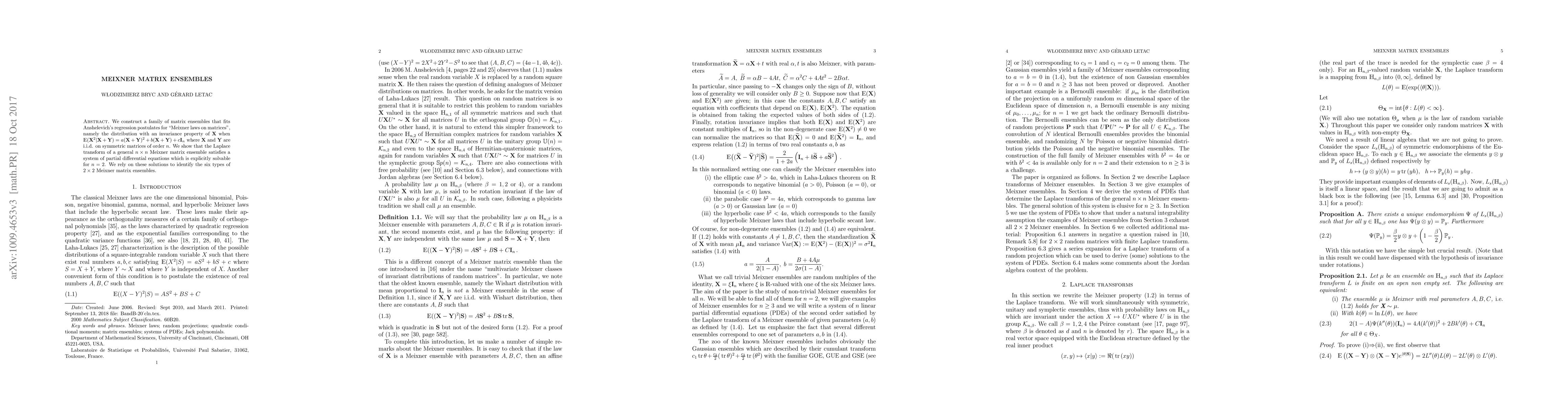 Researchers developed a family of matrix ensembles that satisfy Anshelevich's regression postulates for Meixner laws on matrices. They identified six types of 2x2 Meixner matrix ensembles by solving partial differential equations.