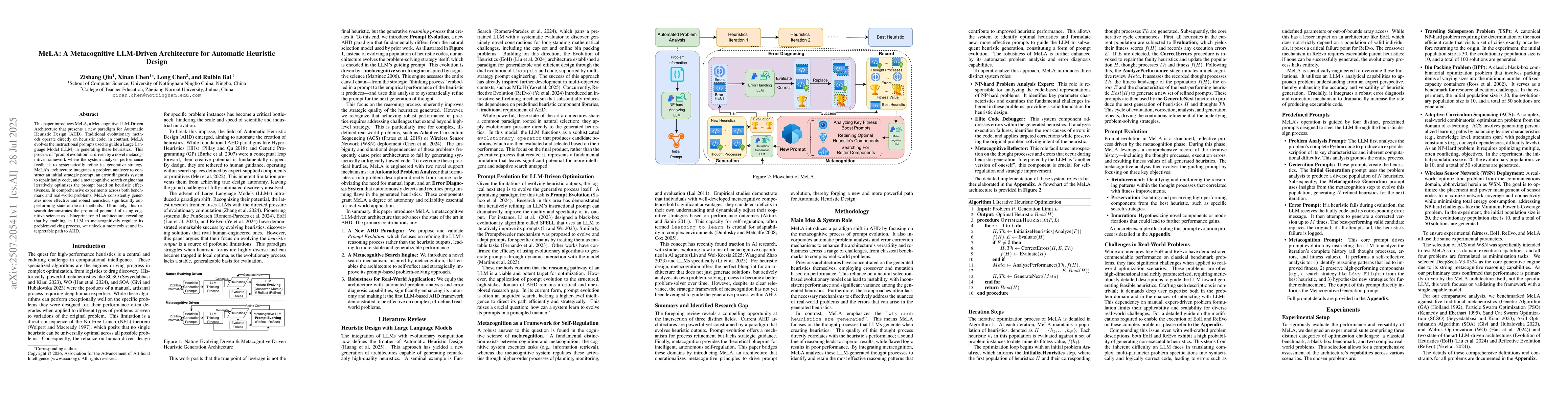 MeLA introduces a metacognitive LLM-driven architecture for automatic heuristic design, integrating prompt evolution and performance feedback-driven refinement.