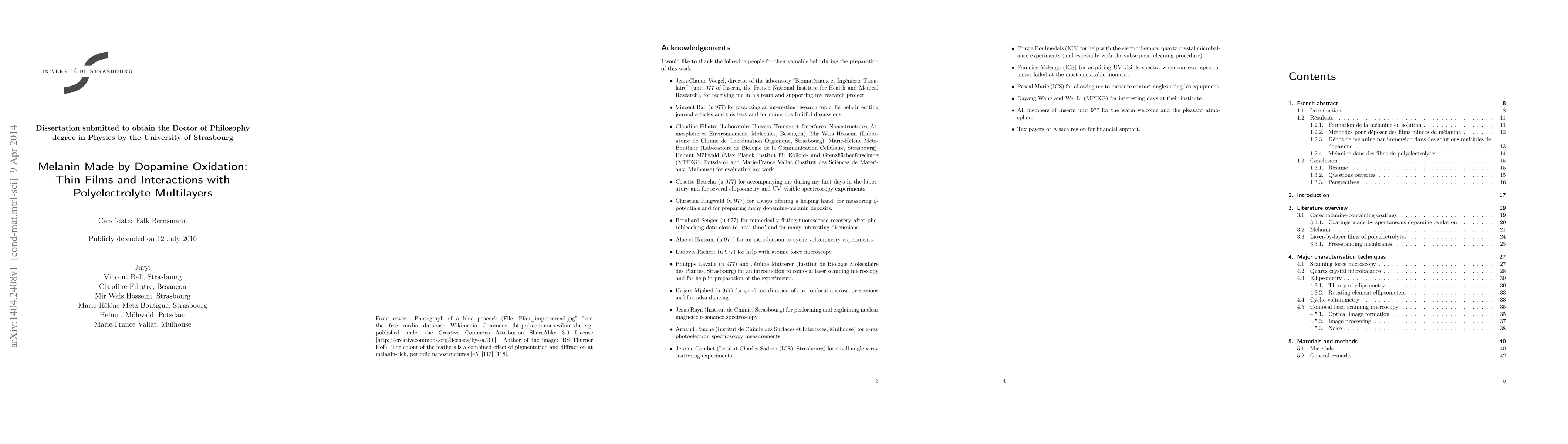 The spontaneous oxidation of dopamine in slightly alkaline solutions was investigated on the basis of the work of Lee and others [Science, 318:426-430, 2007], and the reaction product was identified as dopamine-melanin. The ability of melanin to covalently bind amine functional groups was confirmed by quantification of the corresponding binding sites on dopamine-melanin aggregates. Furthermore it is possible to redissolve dopamine-melanin aggregates in strongly alkaline solutions. The obtained small melanin grains were used to build layer-by-layer deposits with poly(diallyldimethylammonium). Different methods of dopamine oxidation to grow melanin films at solid--liquid interfaces were developed. All examined methods lead to continuous dopamine-melanin films with very similar surface morphologies. The dopamine-melanin films become impermeable to electrochemical probes at a thickness in the 10 nm range. In this context a higher permeability for positively charged and neutral probes than for negatively charged ones was confirmed for one preparation method. The adsorption of proteins on dopamine-melanin coatings was explained as combination of electrostatic and strong, most probably covalent, interactions. To obtain this explanation, the zeta-potential of dopamine-melanin deposits has been measured as a function of pH. The formation of melanin by dopamine oxidation in layer-by-layer films of poly(L-lysine) (PLL) and hyaluronate (HA) was studied: Melanin is able to homogeneously fill $(\text{PLL-HA})_n$ films and the obtained polyelectrolyte-melanin composites can be detached from their substrate as free-standing membranes prepared by a biomimetic method in mild conditions.