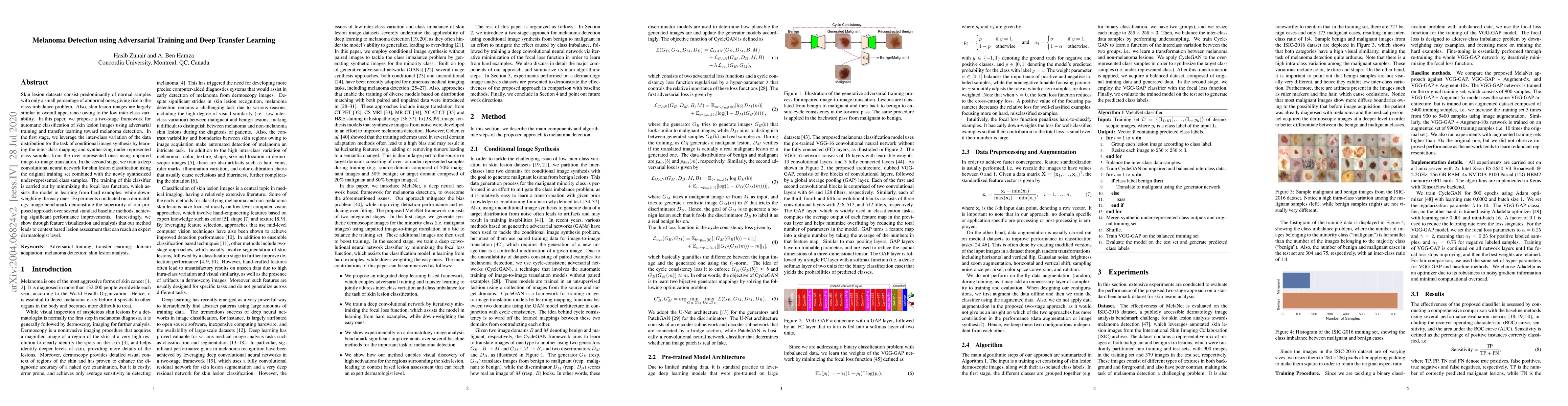 This paper proposes a two-stage framework for melanoma detection using adversarial training and deep transfer learning to address class imbalance and low inter-class variability in skin lesion images. The method synthesizes under-represented samples and trains a deep CNN with focal loss, achieving superior performance and expert-level lesion assessment.