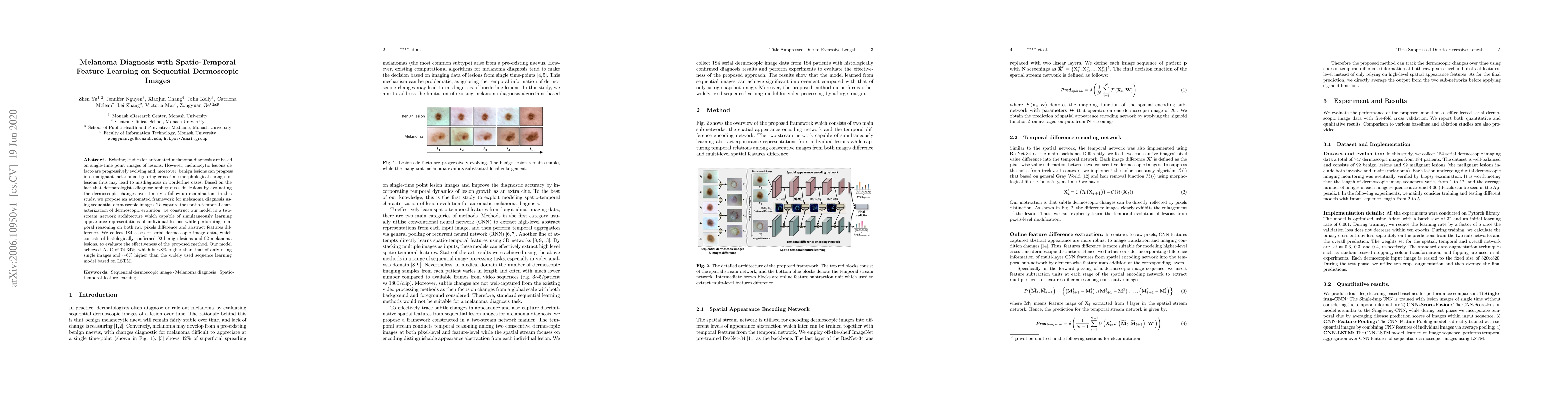 This study proposes an automated melanoma diagnosis framework using sequential dermoscopic images to capture the spatio-temporal evolution of lesions, achieving an AUC of 74.34%, outperforming methods that rely solely on single-time point images or traditional LSTM models.
