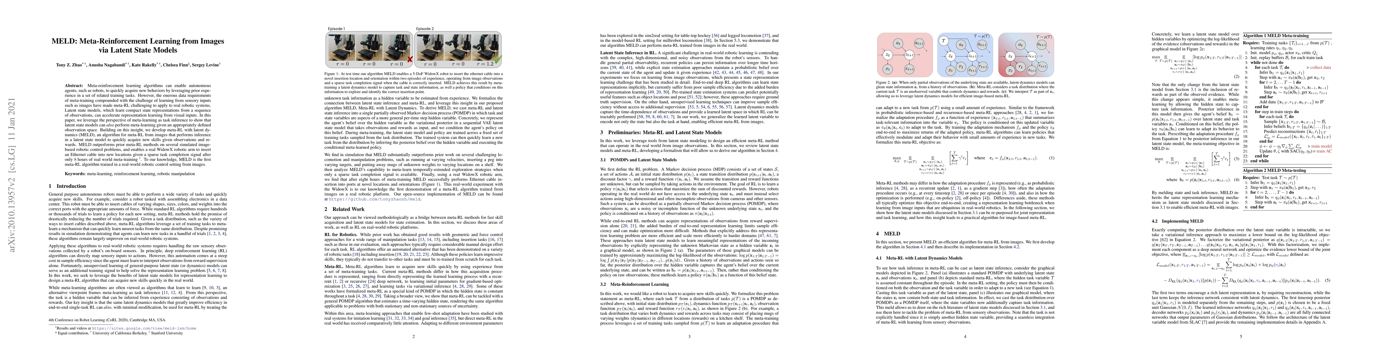 This paper introduces MELD, a meta-reinforcement learning algorithm that leverages latent state models to efficiently learn from image-based observations. MELD outperforms existing methods in simulated tasks and enables a real robotic arm to acquire new skills with minimal training time.