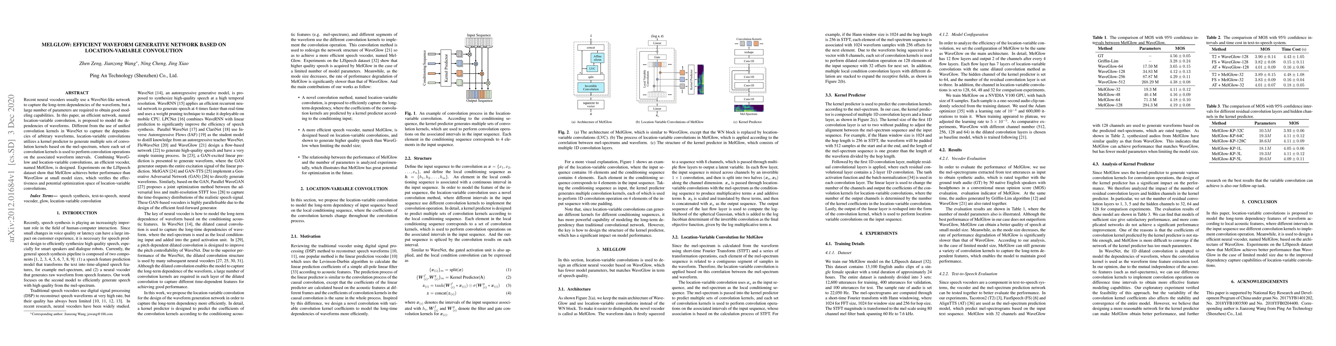 MelGlow introduces an efficient waveform generative network using location-variable convolutions to model waveform dependencies, reducing parameter count. Experiments show MelGlow outperforms WaveGlow in performance at smaller model sizes, demonstrating the effectiveness of the proposed approach.